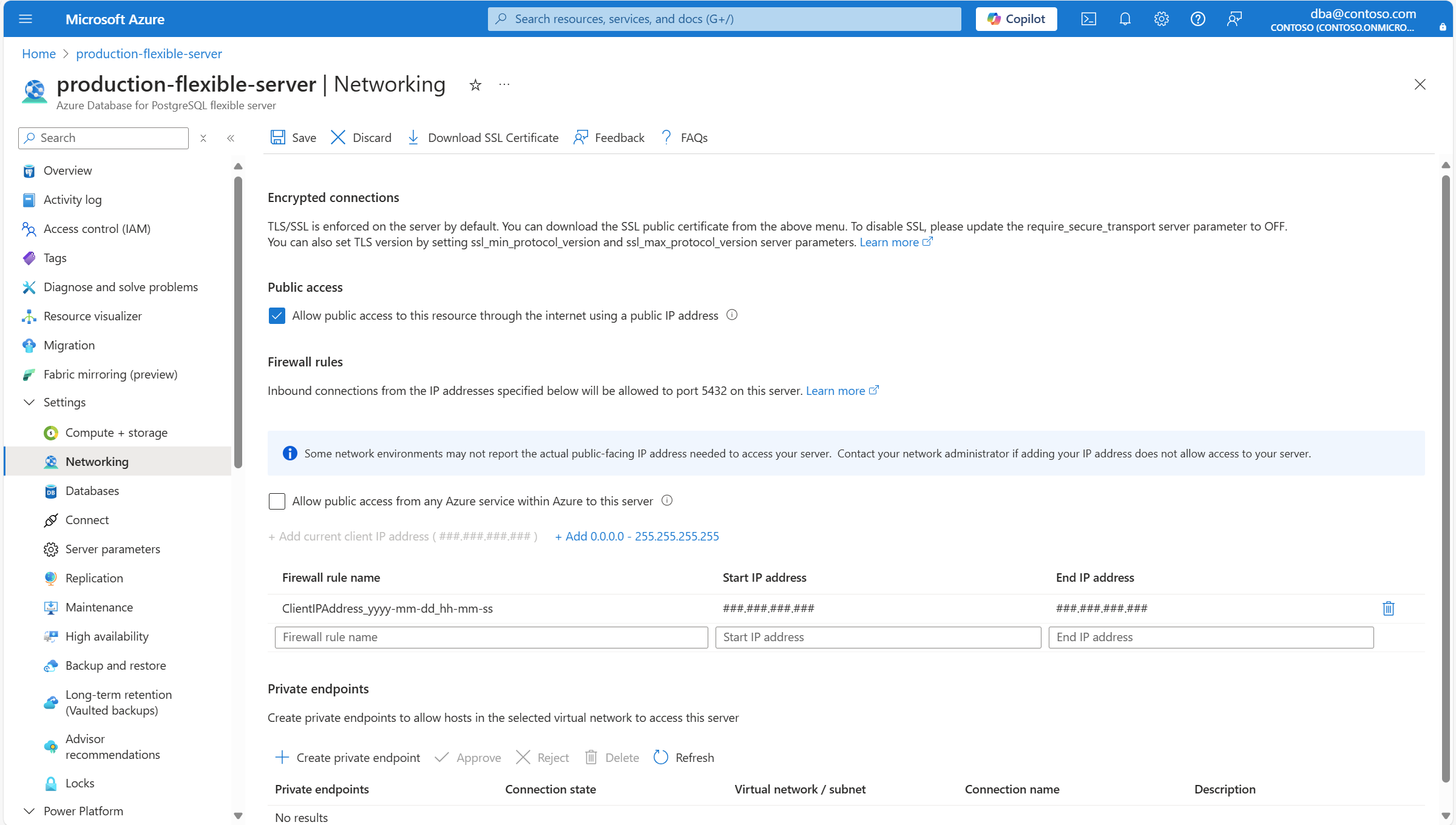 启用公共访问后,可以配置防火墙规则,以允许源自特定 IP 地址或来自任何 Azure 服务的连接。