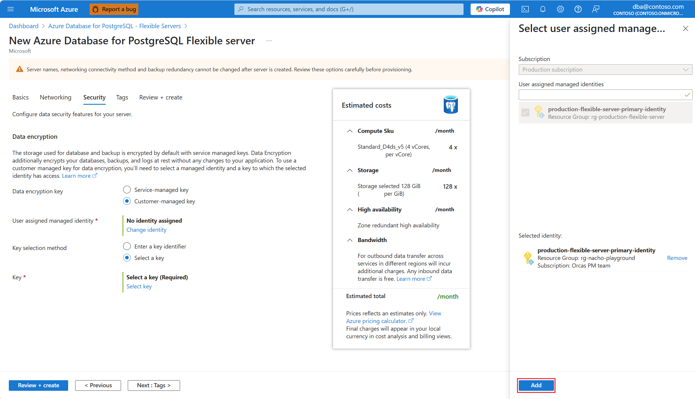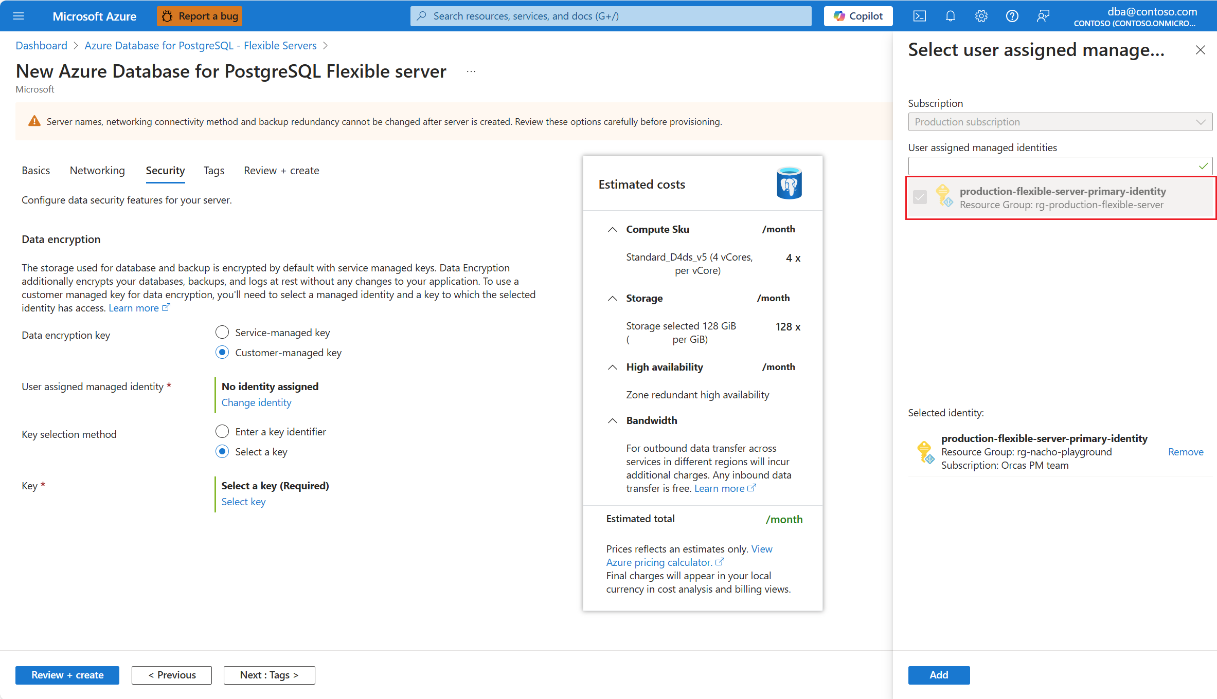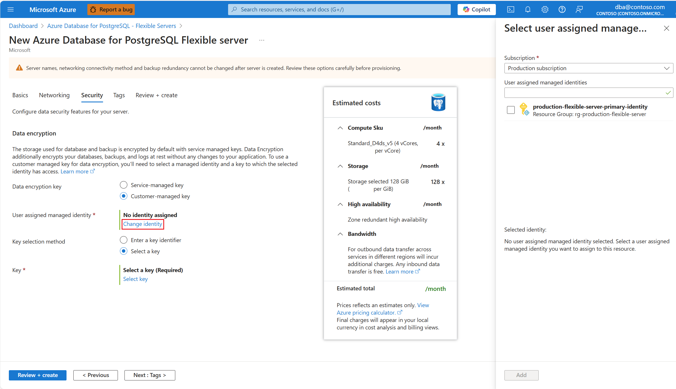 组合框中显示的标识只是为 Azure Database for PostgreSQL 灵活服务器实例分配的标识。 为了保持区域复原能力,我们建议在服务器所在的同一区域中选择用户托管标识,尽管这并非强制性操作。 如果服务器启用了异地备份冗余,建议将用于访问异地冗余备份数据加密密钥的第二个用户托管标识放在服务器的配对区域中。