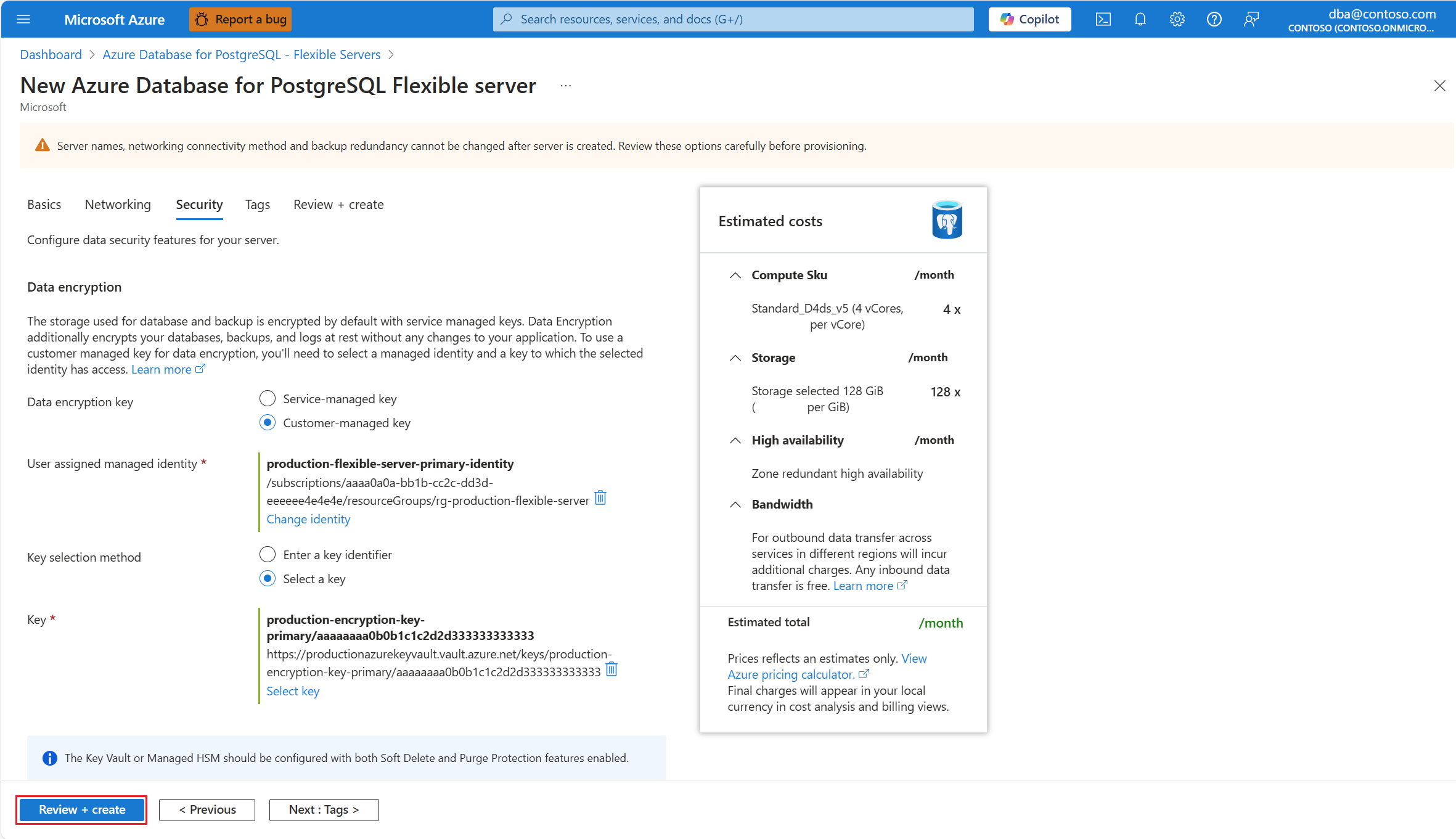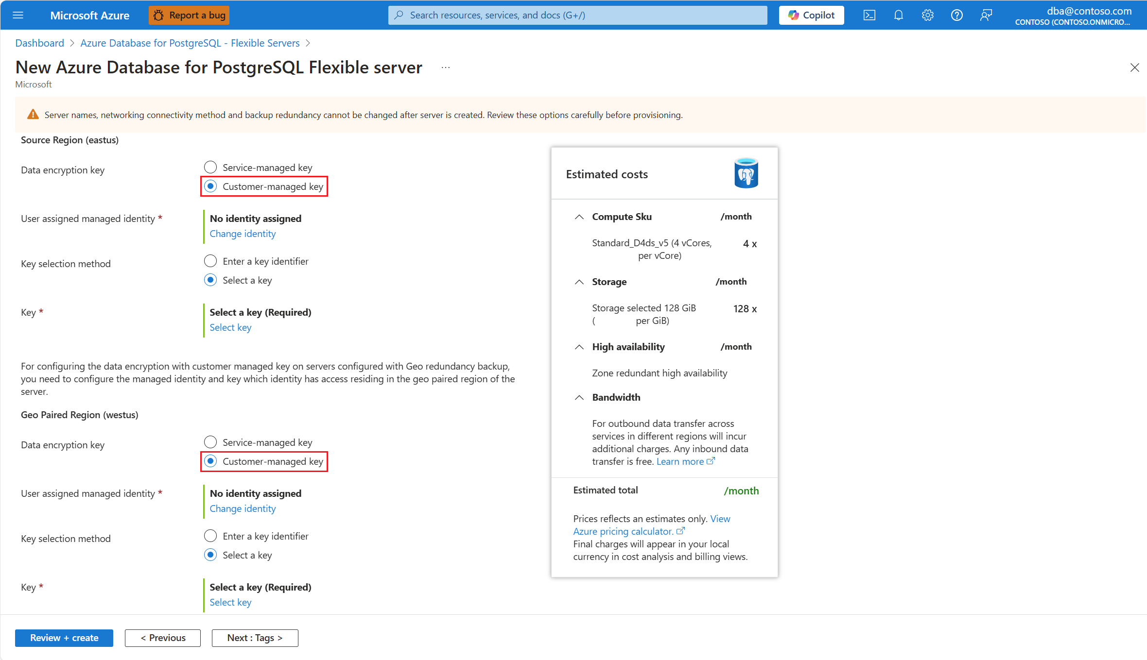 如果要将异地冗余备份存储与服务器一起预配,则“安全性”选项卡方面略有变化,因为服务器使用两个单独的加密密钥。 一个用于部署服务器的主要区域,另一个用于将服务器备份异步复制到的配对区域。