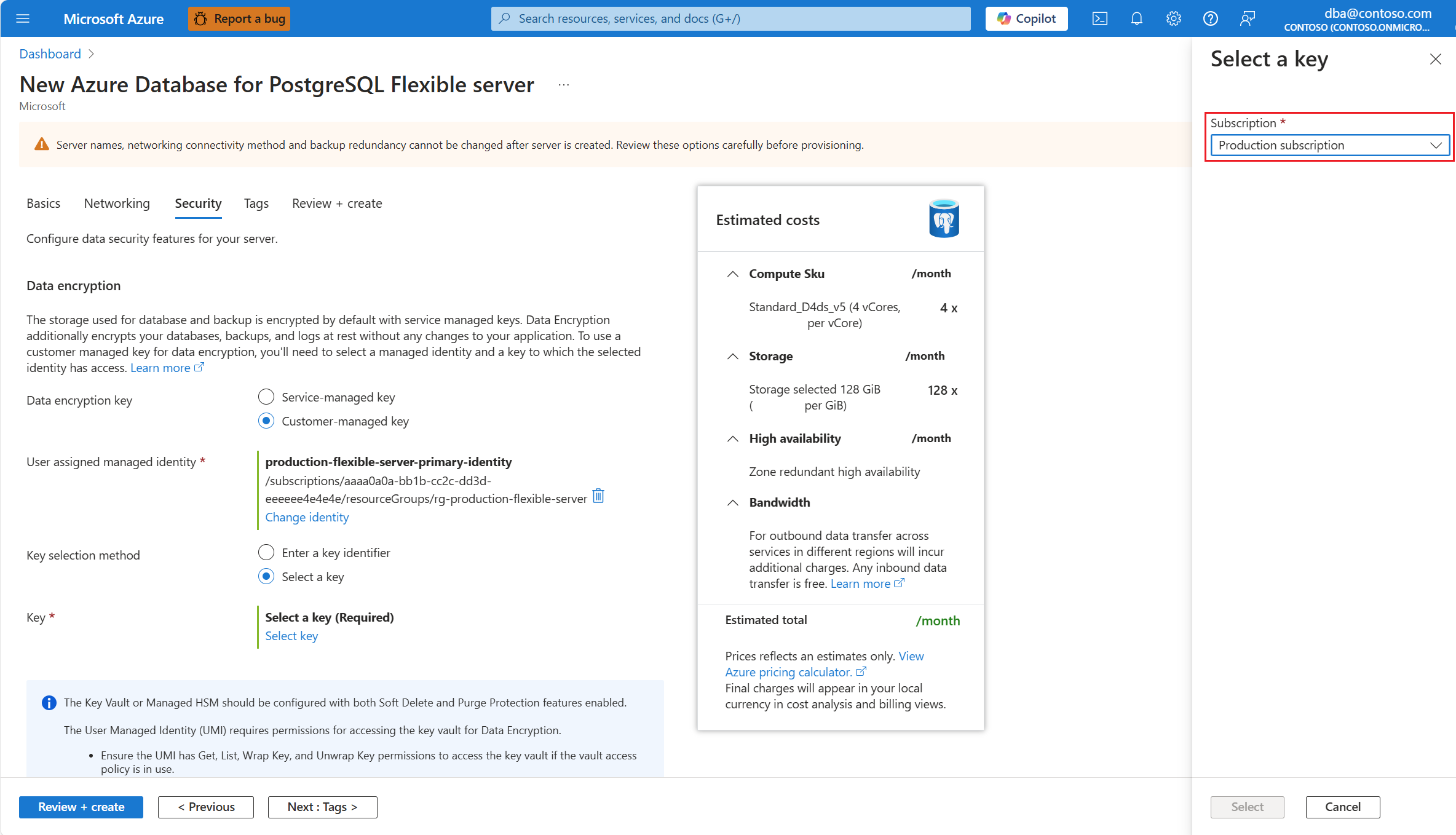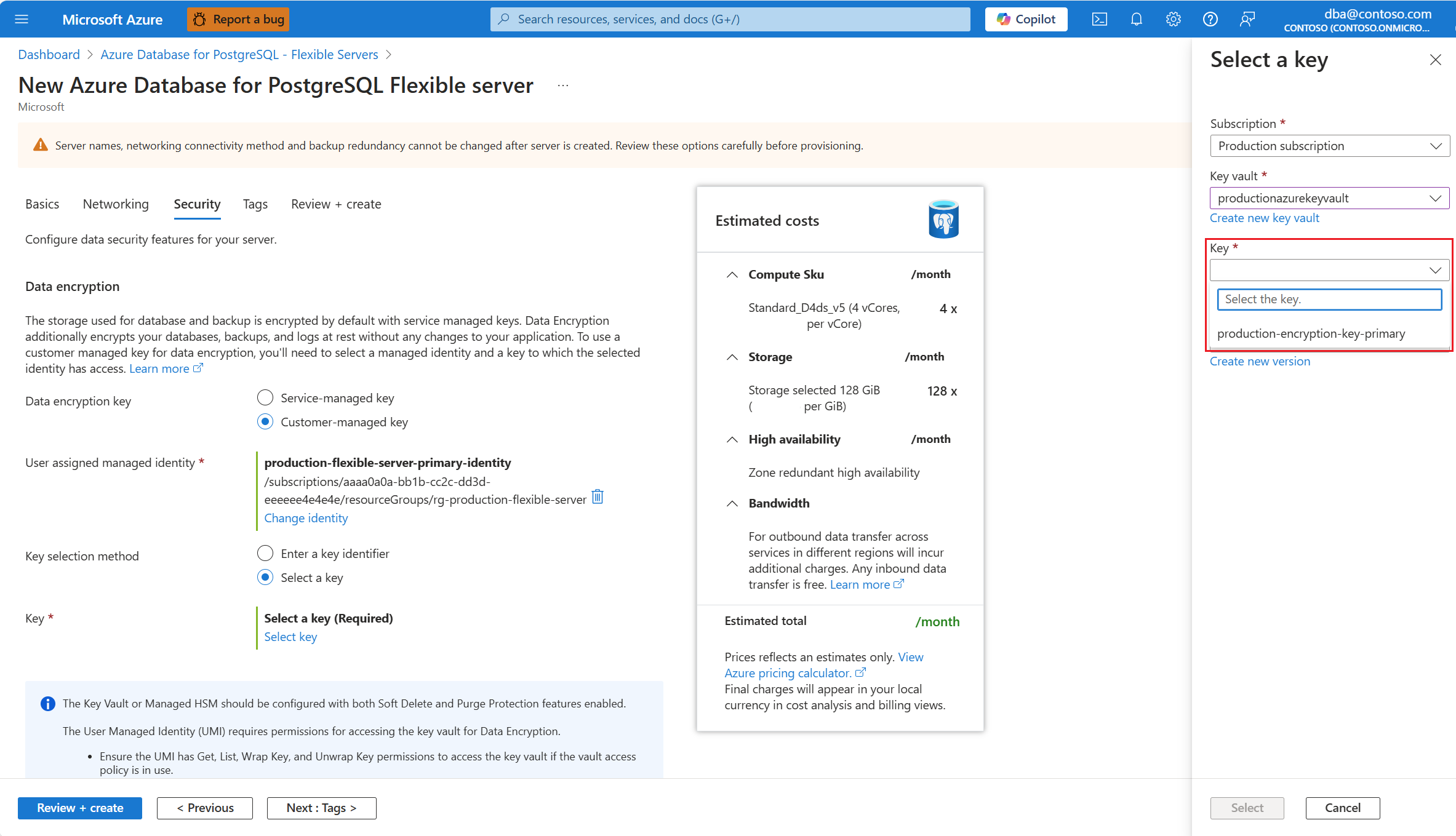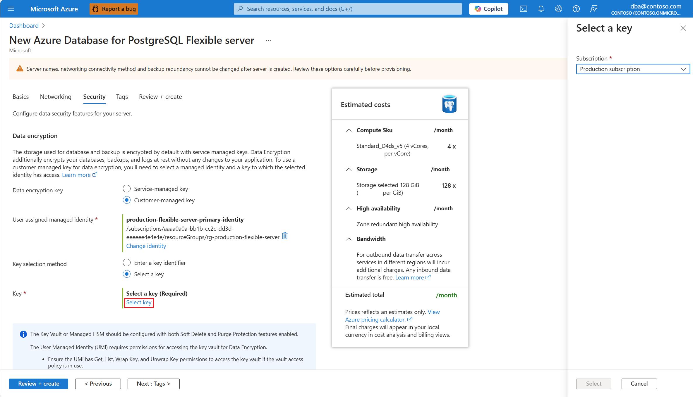 在预配新的 Azure Database for PostgreSQL 灵活服务器实例期间,数据加密在 “安全 ”选项卡中进行配置。对于 数据加密密钥,请选择 “客户管理的密钥 ”单选按钮。