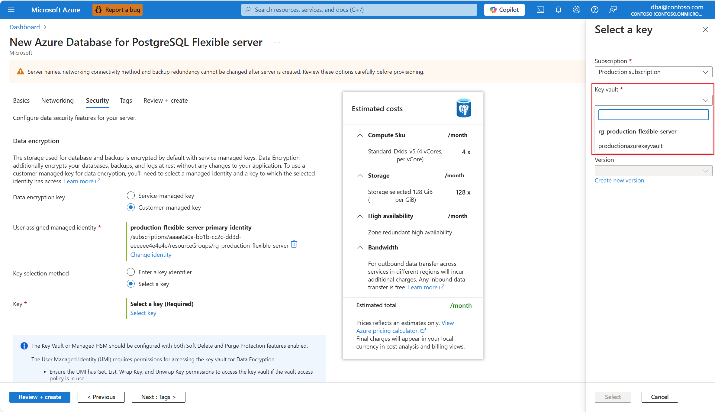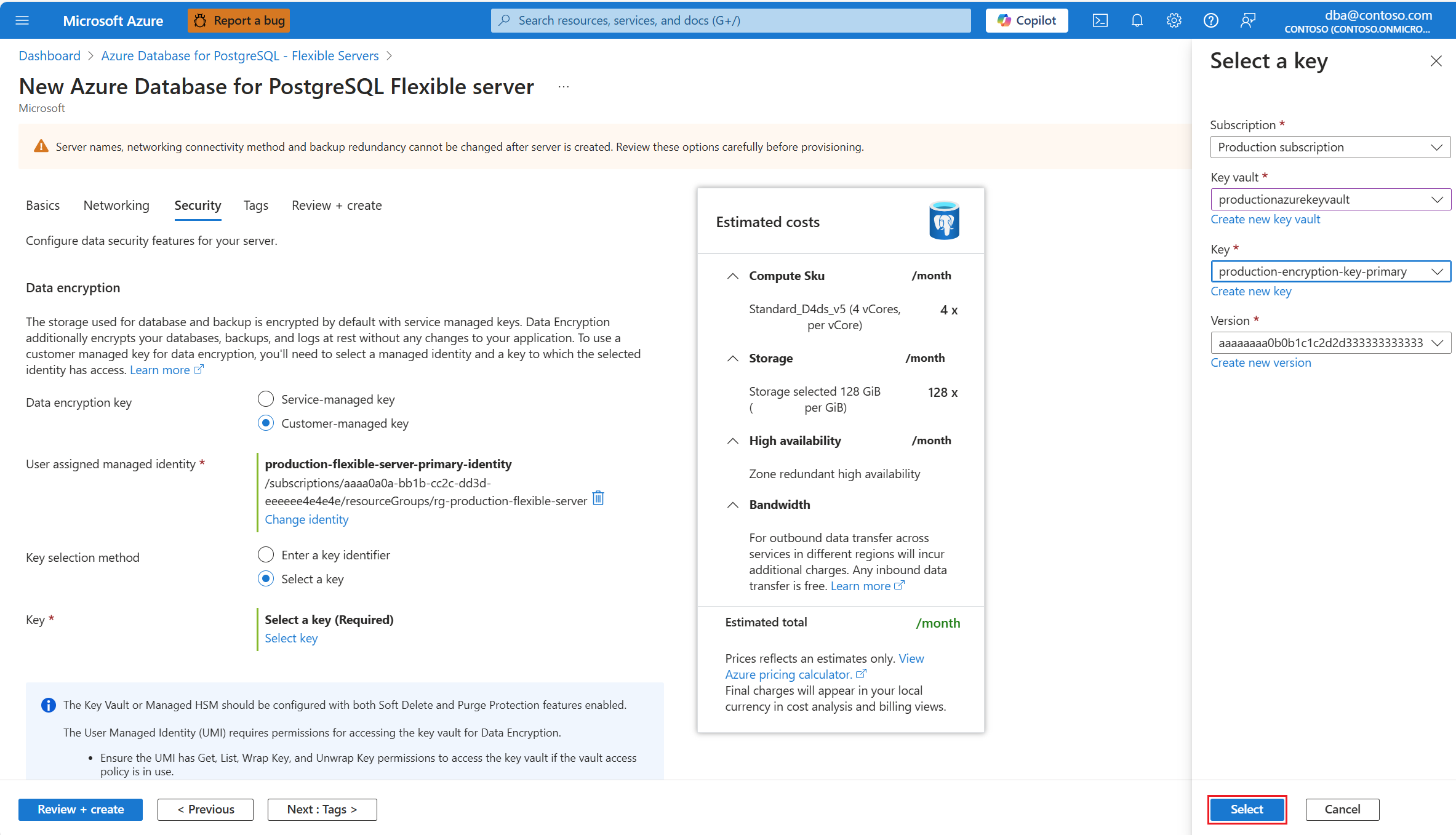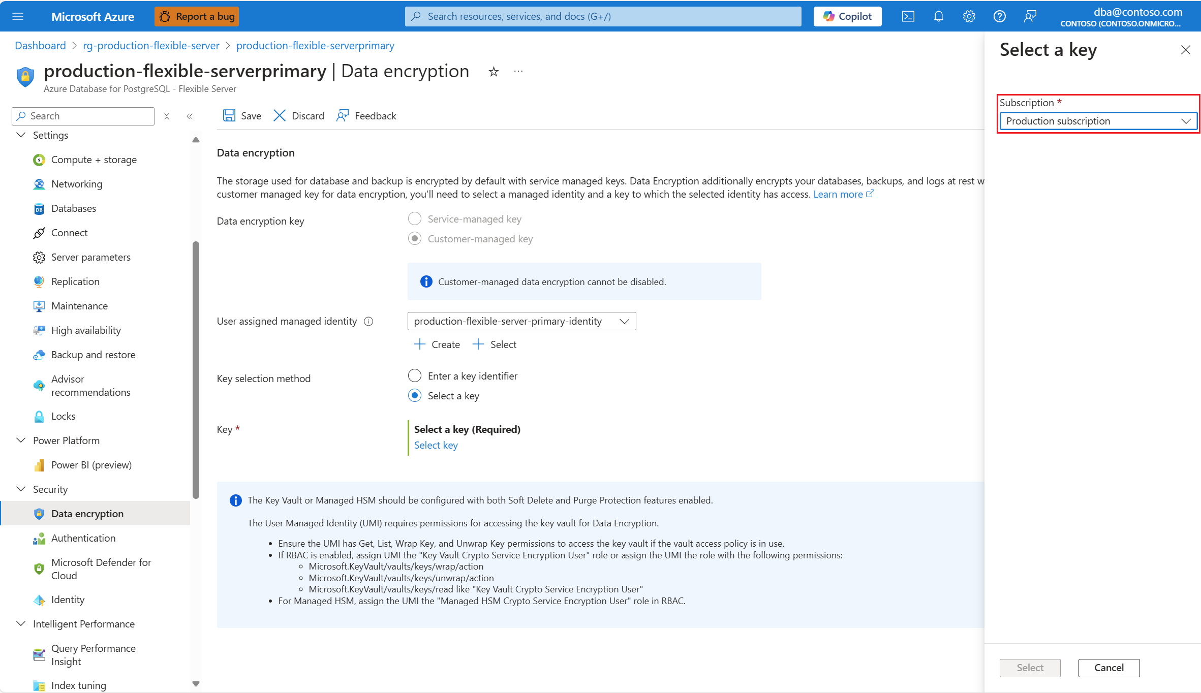 在预配新的 Azure Database for PostgreSQL 灵活服务器实例期间,数据加密在 “安全 ”选项卡中进行配置。对于 数据加密密钥,请选择 “客户管理的密钥 ”单选按钮。