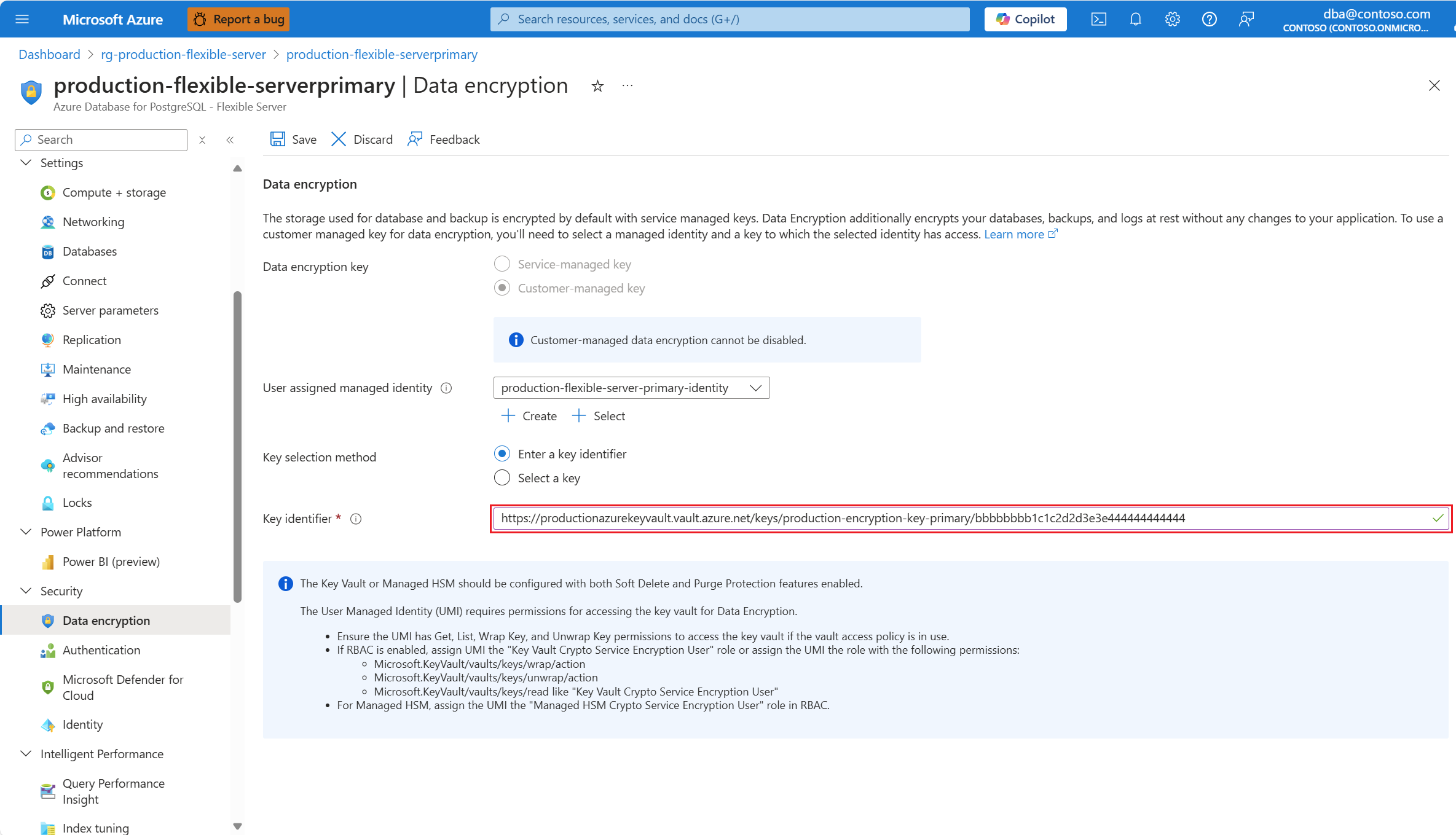 如果轮换密钥或使用其他密钥,则必须更新 Azure Database for PostgreSQL 灵活服务器实例,使其指向新的密钥版本或新密钥。 为此,可以复制密钥的资源标识符,并将其粘贴到“密钥标识符”框中。