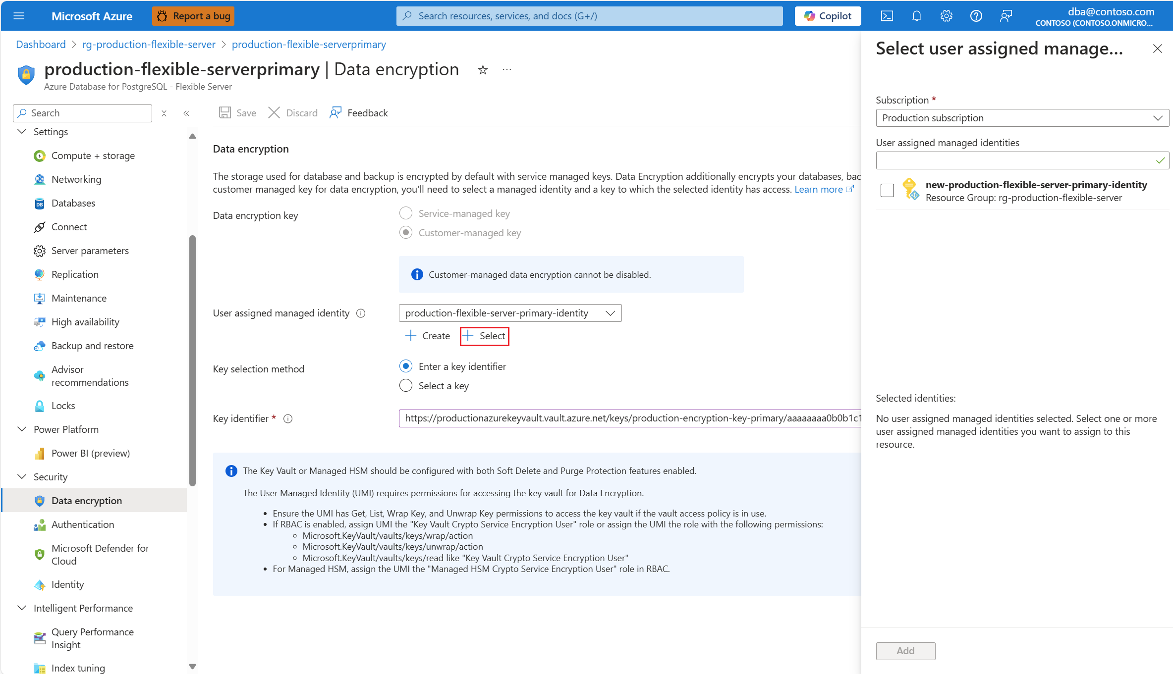 如果用于访问数据加密密钥的用户分配的托管标识未分配到您的 Azure Database for PostgreSQL 灵活服务器实例,但它作为一个 Azure 资源与在 Microsoft Entra ID 中的相应对象存在,您可以通过选择 选择 来进行分配。