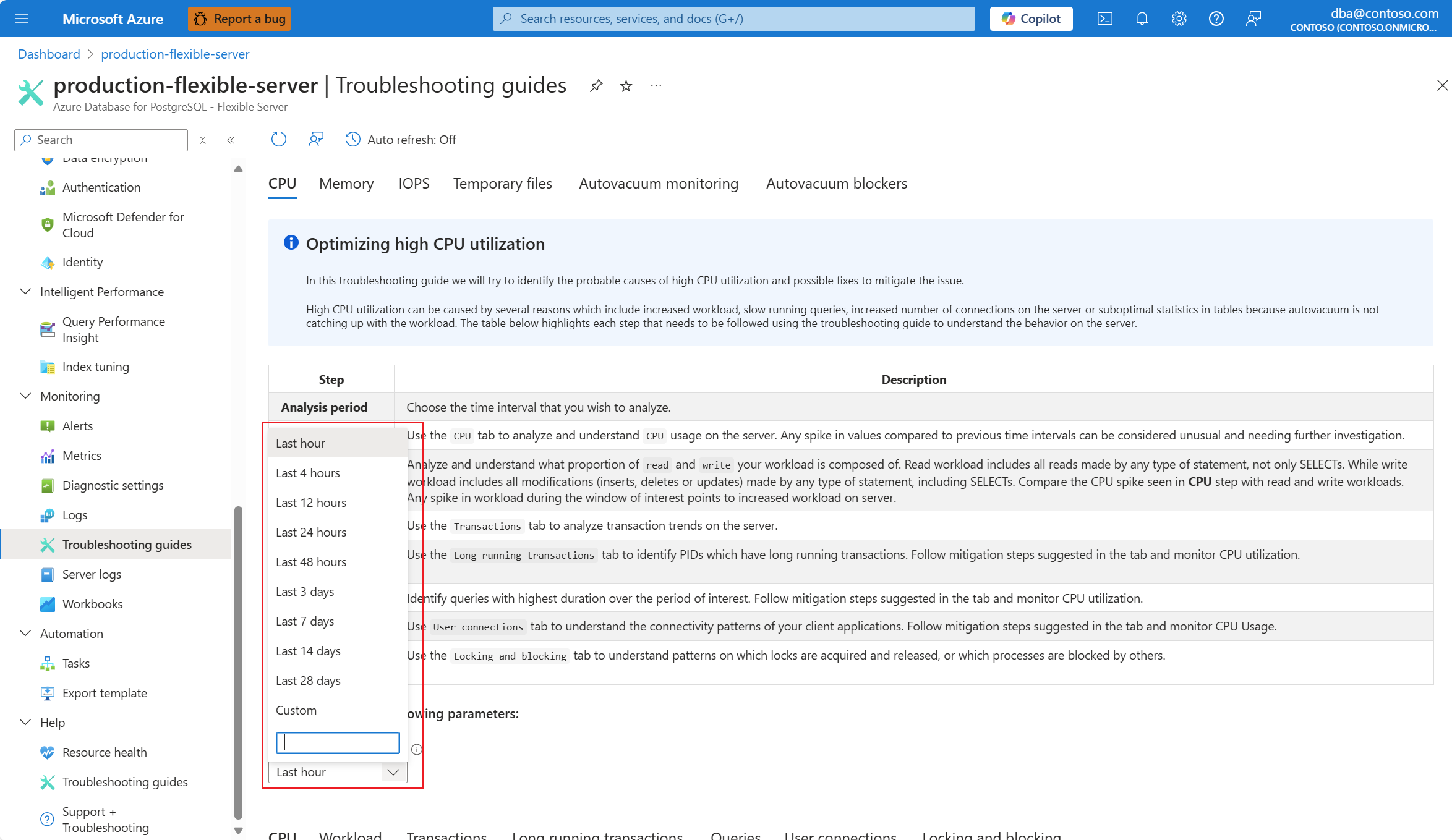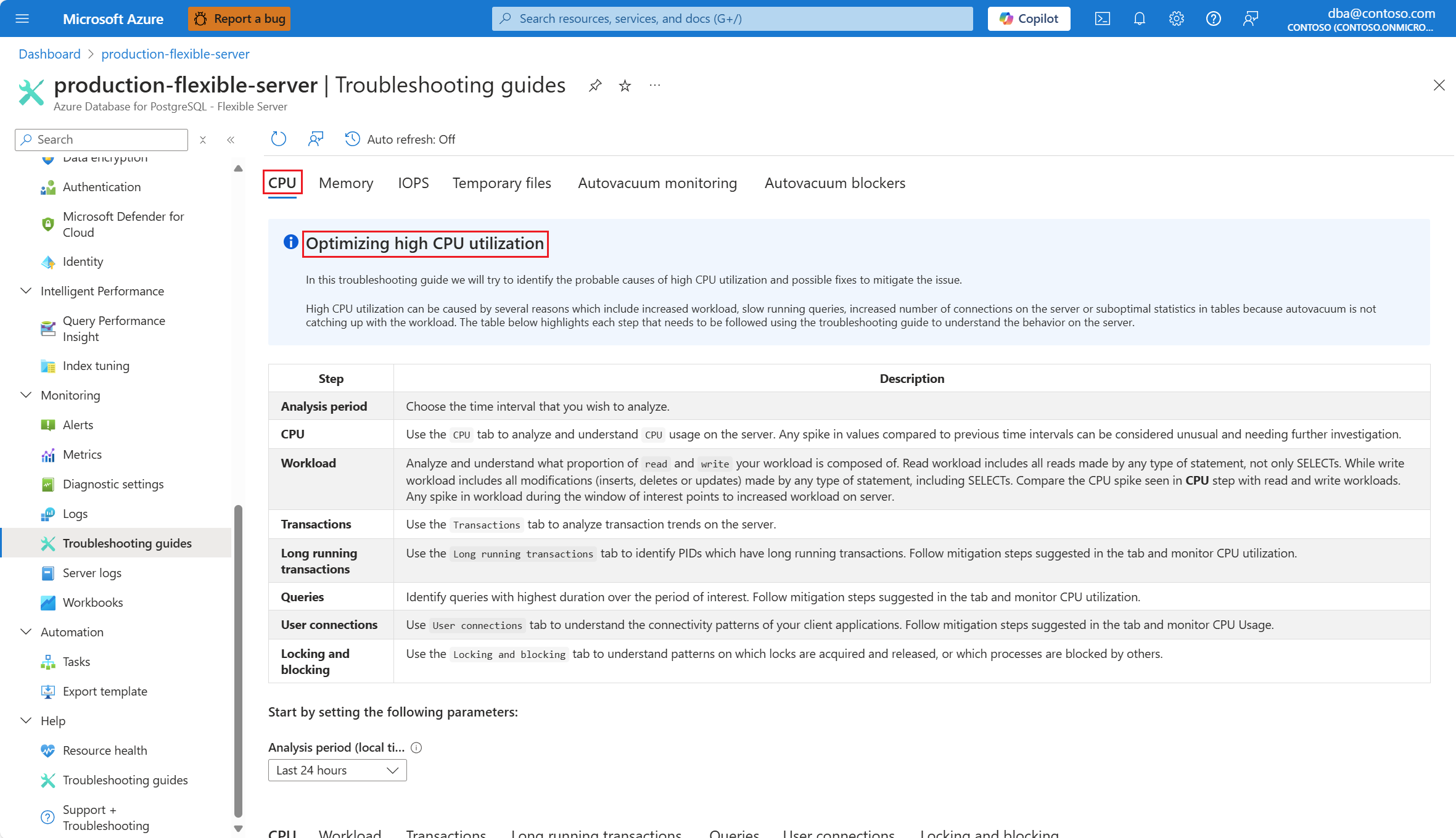 收到 CPU 方案发出的警报后,在受影响的 Azure Database for PostgreSQL 灵活服务器实例的资源菜单中的“监视”部分下,选择“故障排除指南”。