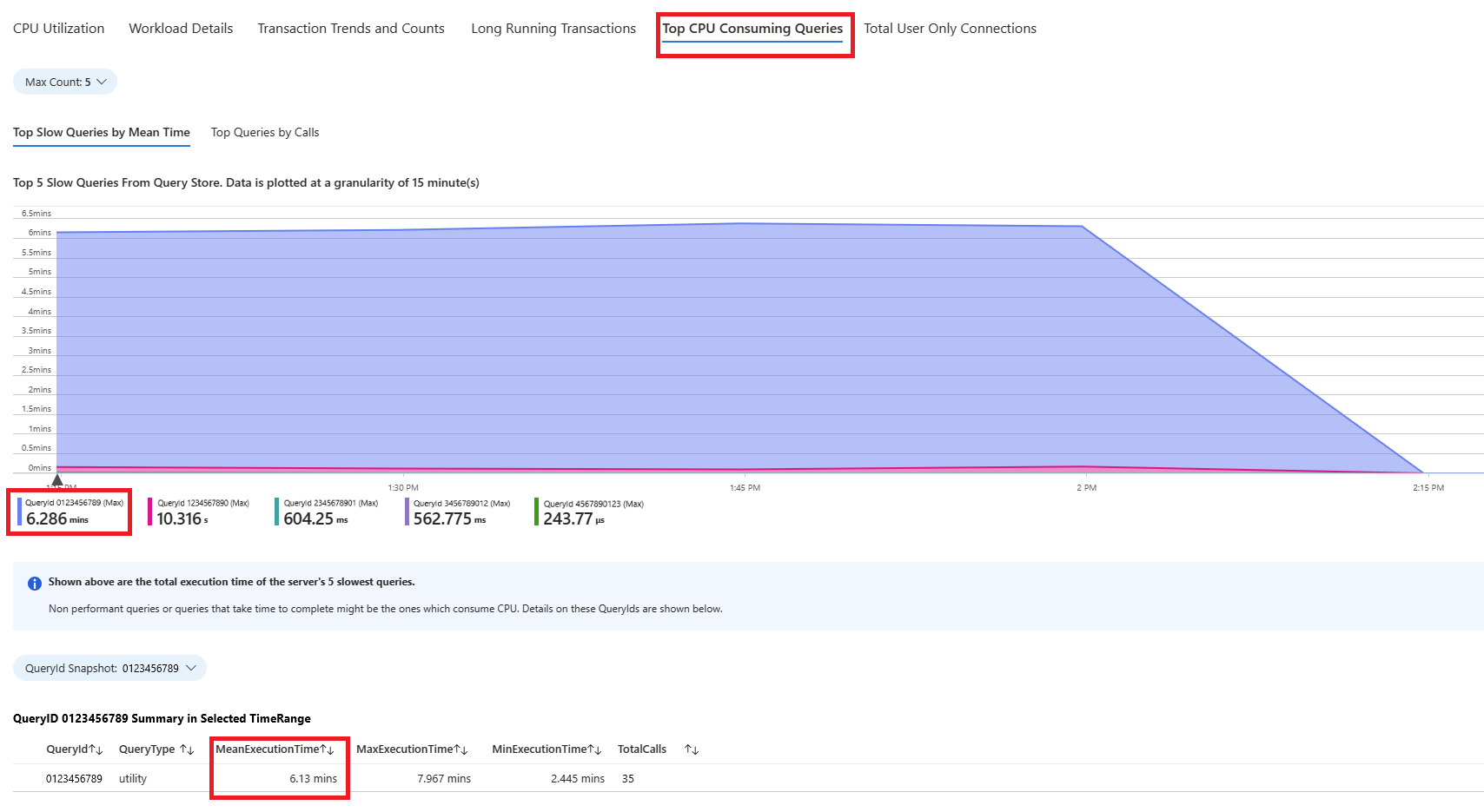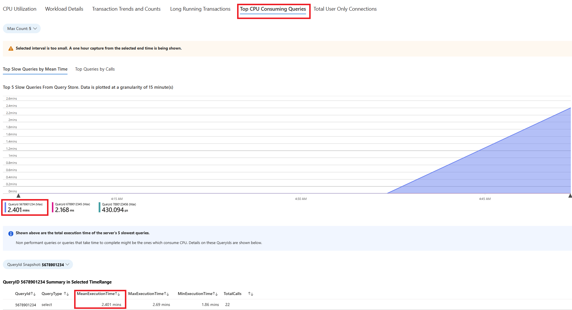 选择“查询”选项卡。其中显示了在 CPU 使用率达到 90% 的时间间隔内运行的所有查询的详细信息。 从快照来看,该时间间隔内平均执行时间最慢的查询约为 2.6 分钟,该查询在该时间间隔内运行了 22 次。 该查询很可能是 CPU 飙升的原因。