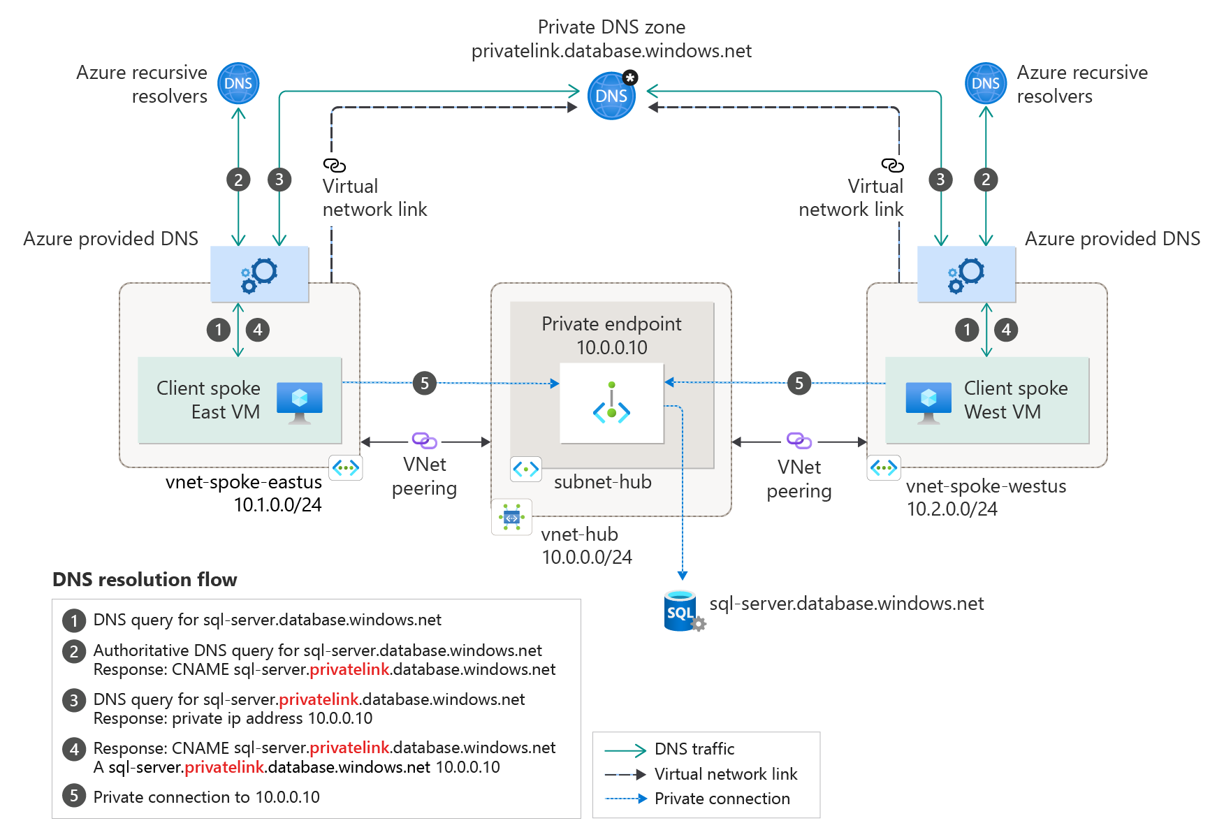 此配置需要使用单个专用 DNS 区域。 所有从本地和对等虚拟网络建立的客户端连接也必须使用同一专用 DNS 区域。