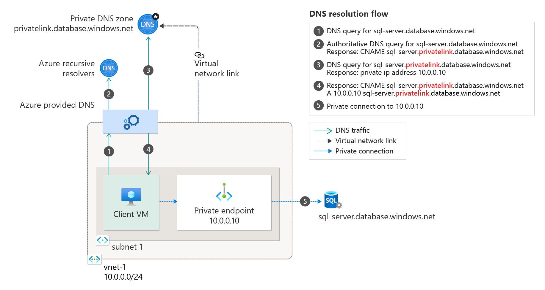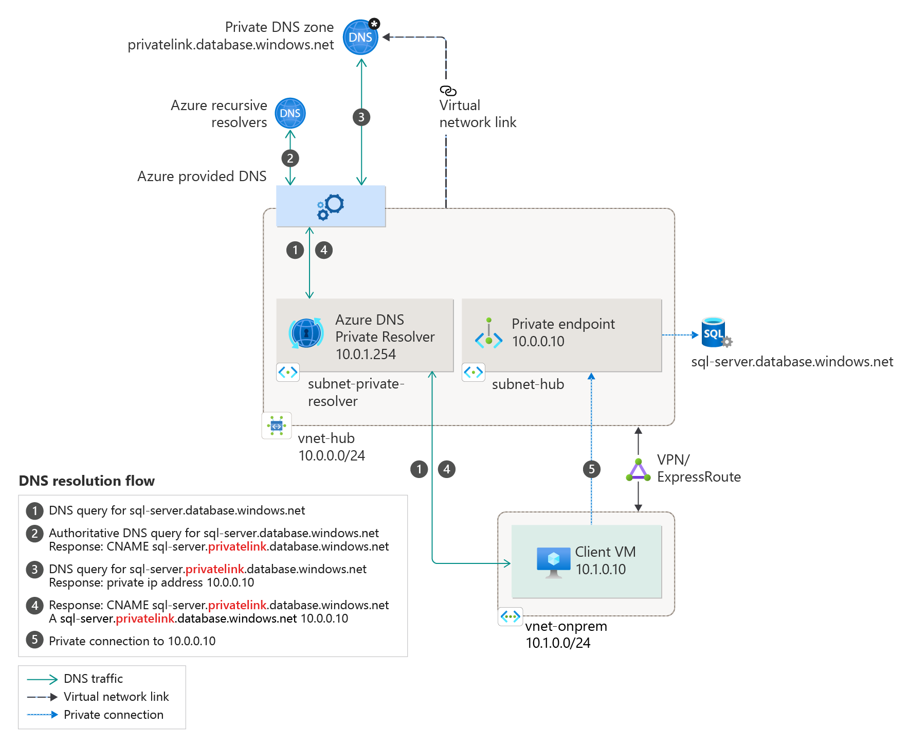 专用终结点的 DNS 查询必须源自链接到专用 DNS 区域的虚拟网络。 DNS 转发器通过代表本地客户端代理查询来启用此功能。 此方案使用 Azure SQL 数据库建议的专用 DNS 区域。 对于其他服务,可以使用以下参考来调整模型:Azure 服务 DNS 区域配置。
