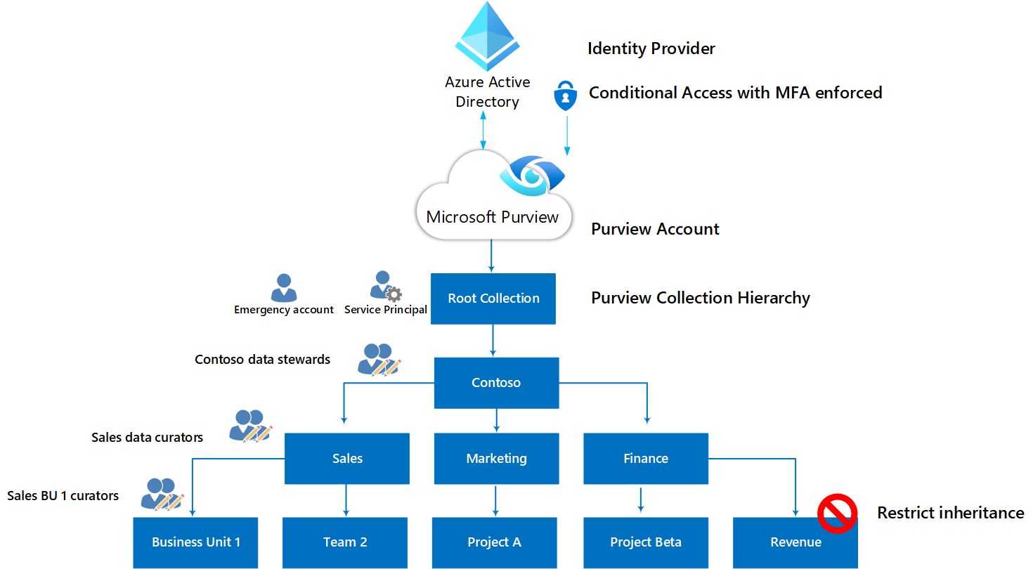 使用 Microsoft Purview 集合 实现组织的元数据层次结构,以实现基于最低特权模型的集中式或委派管理和治理层次结构。