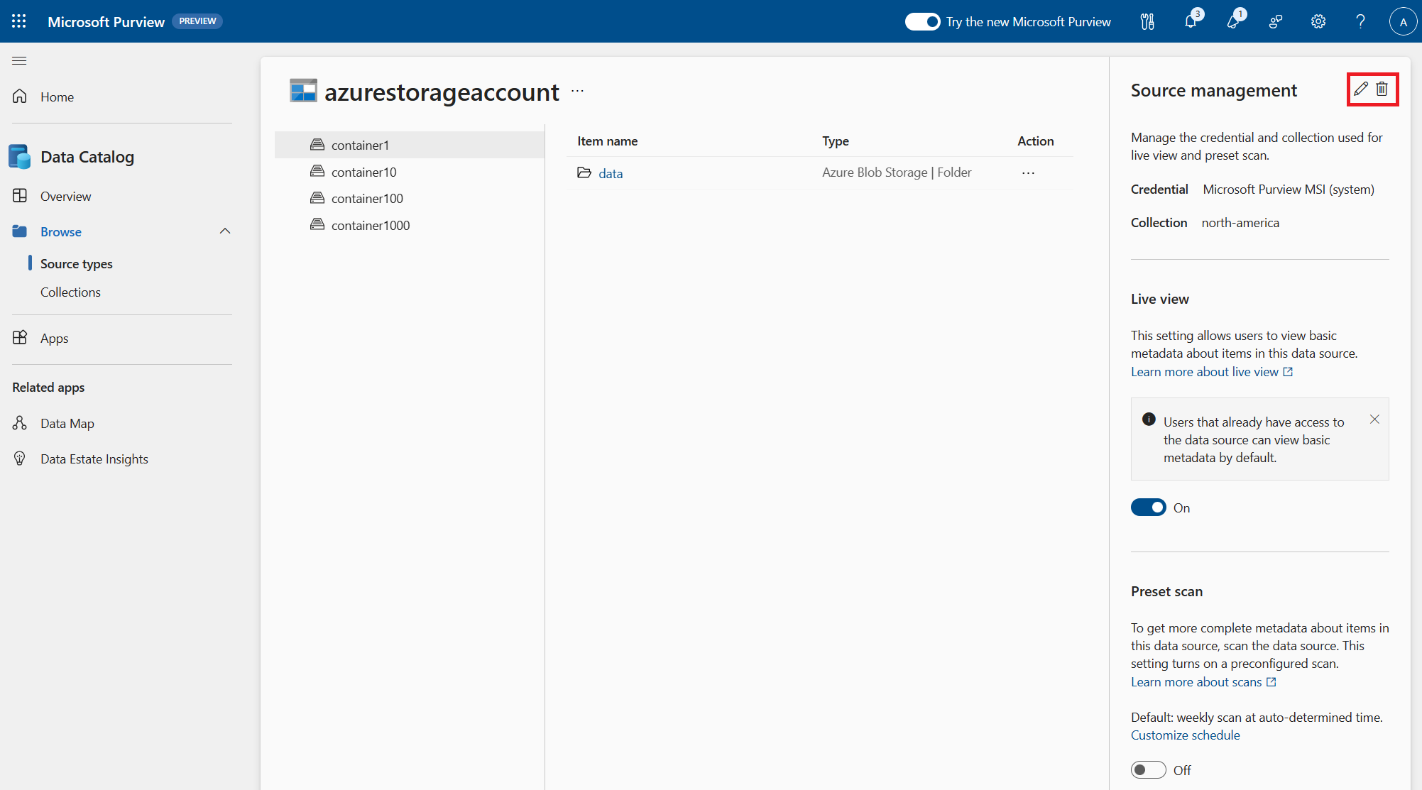 如果你有扩展的实时视图权限或运行预设扫描,则实时视图资源将具有允许 Microsoft Purview 访问它的凭据。