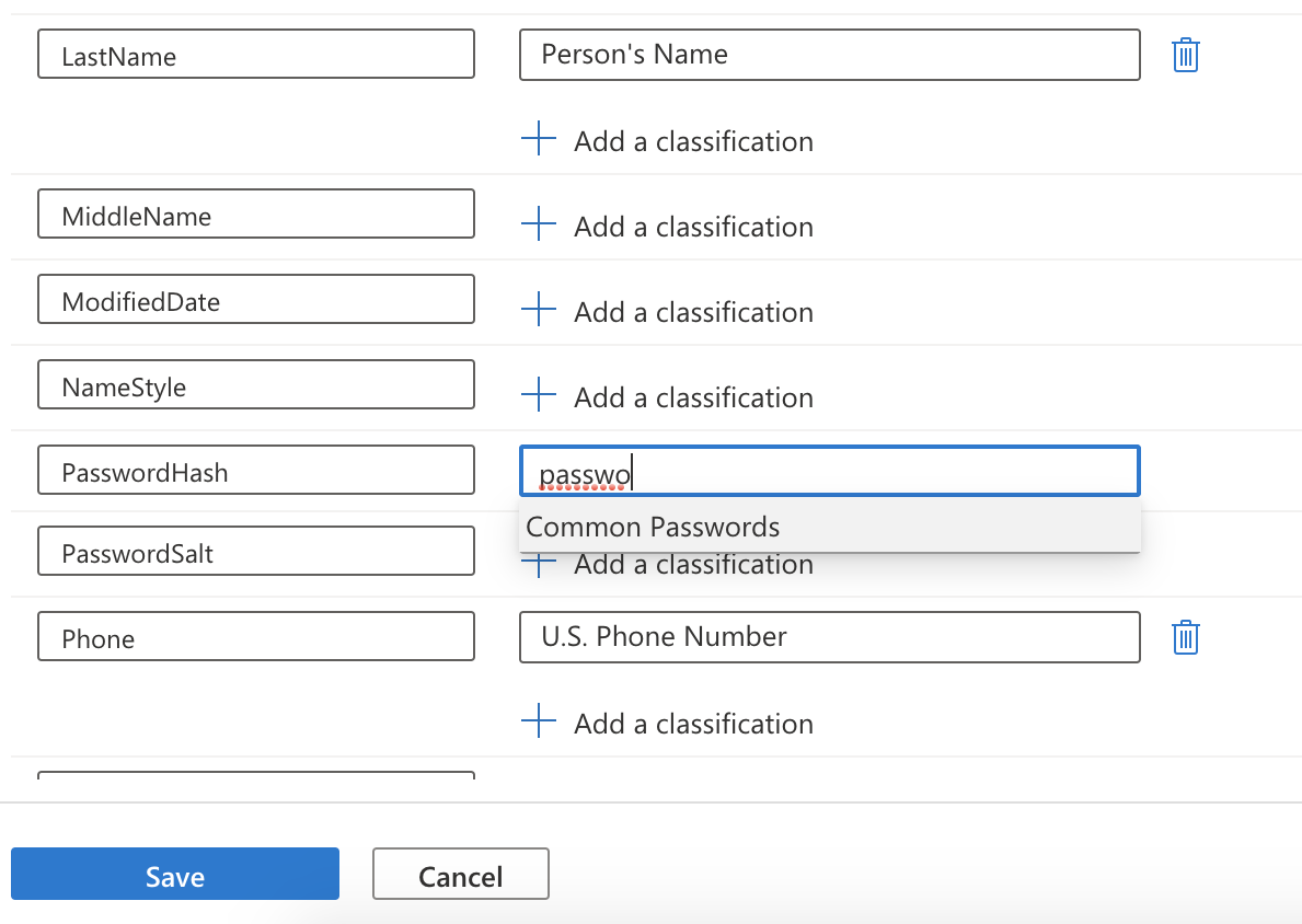 确定感兴趣的列,然后选择 “添加分类”。 本示例将 通用密码 分类添加到 PasswordHash 列。