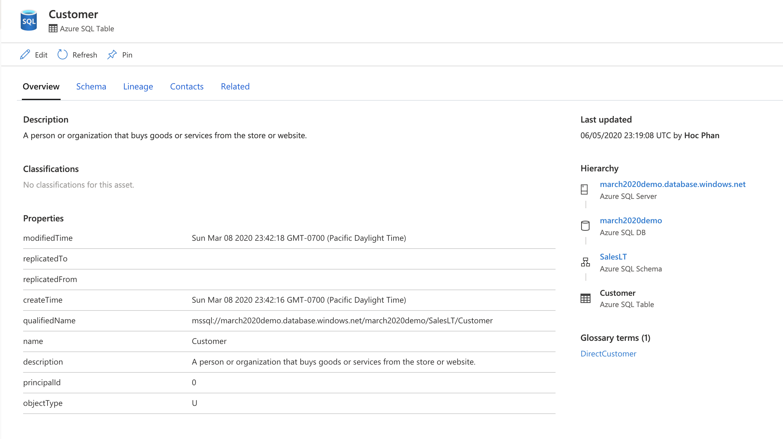 搜索或浏览统一目录,查找感兴趣的表资产。 例如, Customer 表。