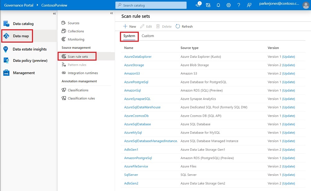 系统扫描规则集是Microsoft定义的扫描规则集,这些规则集会自动为每个 Microsoft Purview 目录创建。 每个系统扫描规则集都与特定的数据源类型相关联。 创建扫描时,可以将其与系统扫描规则集相关联。 每次Microsoft对这些系统规则集进行更新时,都可以在目录中更新它们,并将更新应用于所有关联的扫描。