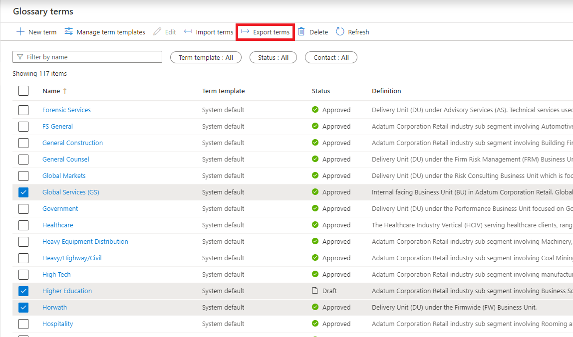 当你处于任何术语表中时,默认情况下“导出术语”按钮被禁用。 选择要导出的术语后,“导出术语”按钮将处于启用状态。