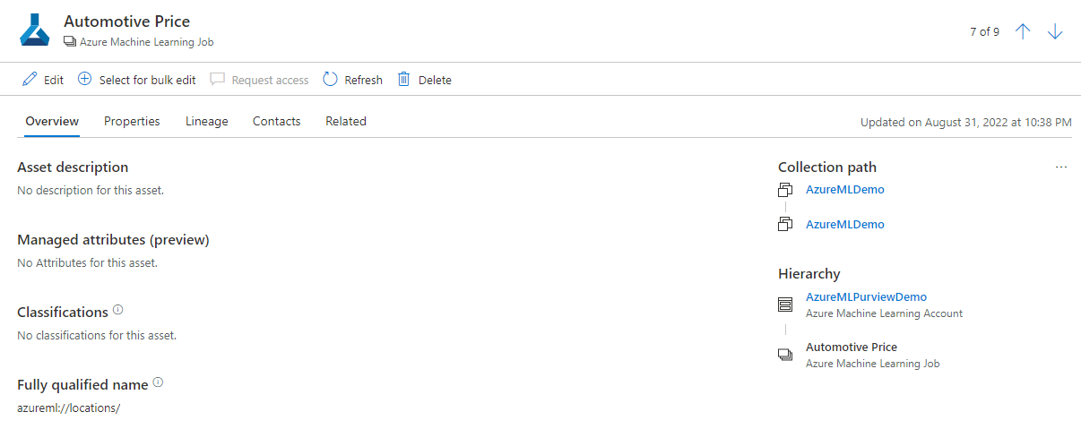 从列表中,可以选择任何资产项以查看详细信息。 例如,选择其中一个 Azure 机器学习作业资产会显示该作业的详细信息。