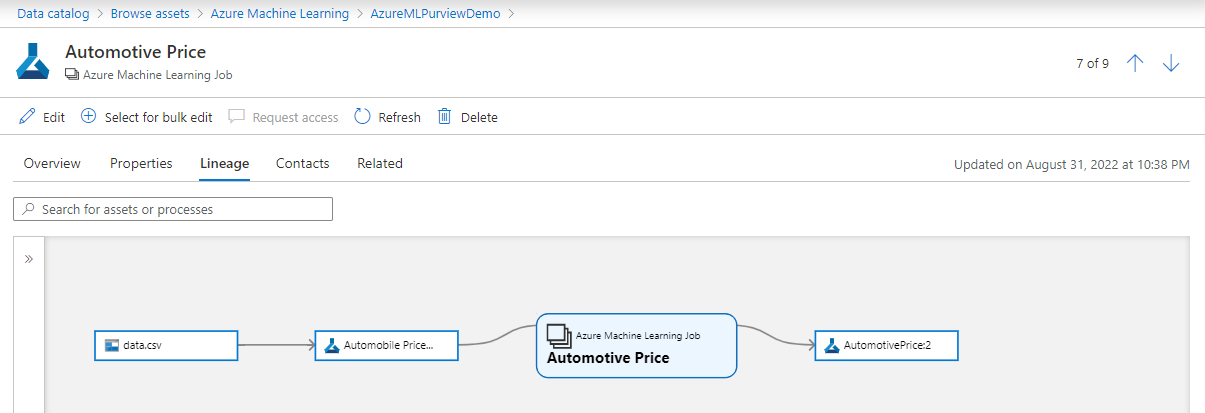 若要查看世系信息,请选择一个资产,然后选择“世系”选项卡。在世系选项卡中,可以看到资产的关系(如果适用)。 可以看到使用了哪些源数据(如果在 Purview 中注册)、在 Azure 机器学习中创建的数据资产、任何作业,以及最后生成的机器学习模型。 在更高级的方案中,可以看到: