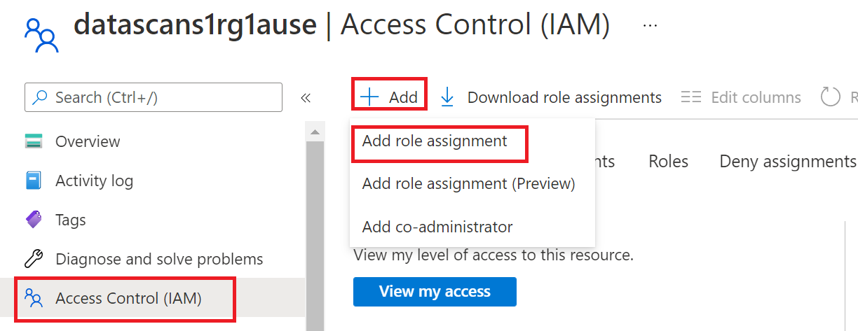 若要配置 Azure 基于角色的访问控制 (RBAC) 权限,请按照指南进行操作。 以下屏幕截图显示了如何访问 Azure 门户中的访问控制部分,以便为数据资源添加角色分配。