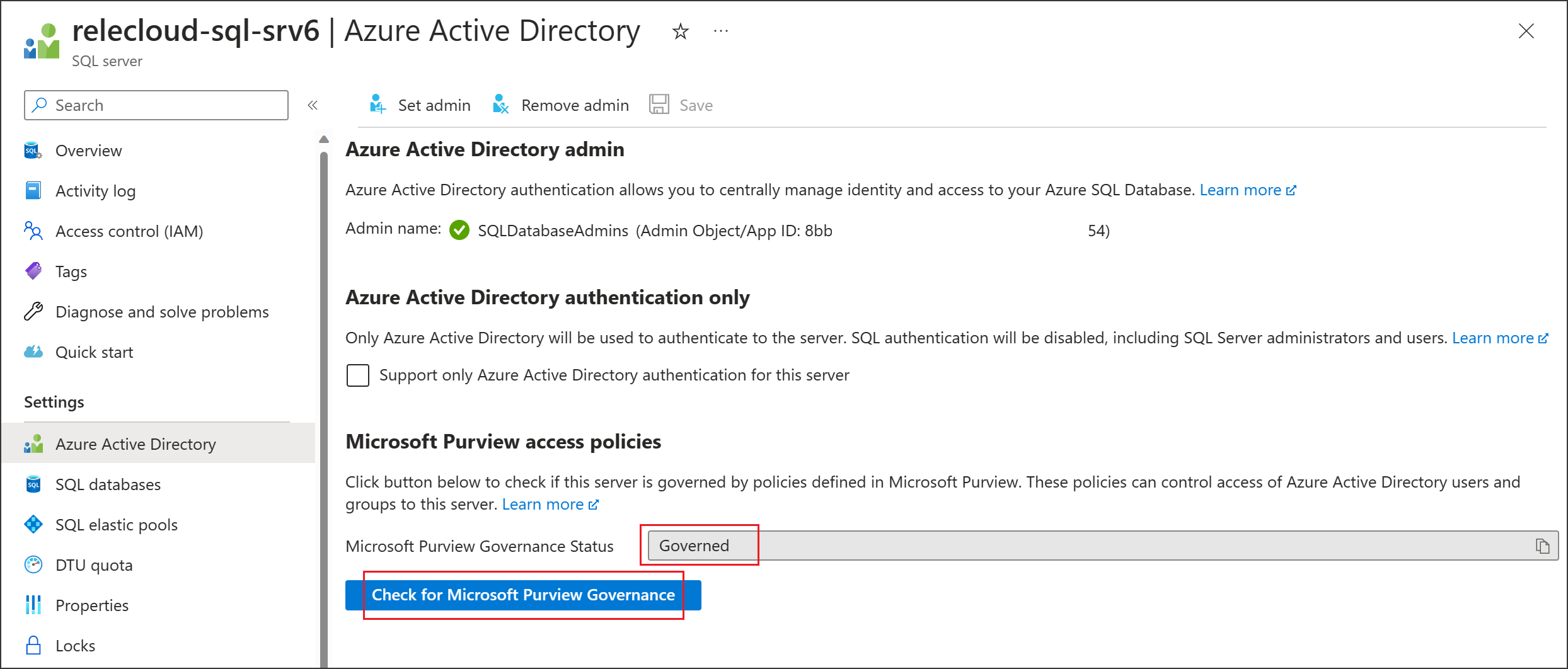 返回到 Azure SQL 数据库的 Azure 门户,验证它现在是否由 Microsoft Purview 治理: