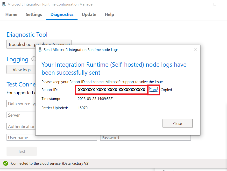 此时会打开“ 使用Microsoft共享自承载集成运行时 (SHIR) 日志 ”窗口。