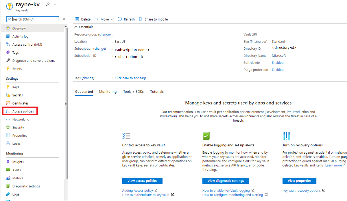 如果要移动启用了 Azure 磁盘加密的 VM,则必须运行脚本。 执行脚本的用户应具有执行该操作的相应权限。 若要了解所需的权限,请参阅下表。 可以转到 Azure 门户中的密钥保管库,查找用于更改权限的选项。 在“设置”下,选择“访问策略” 。