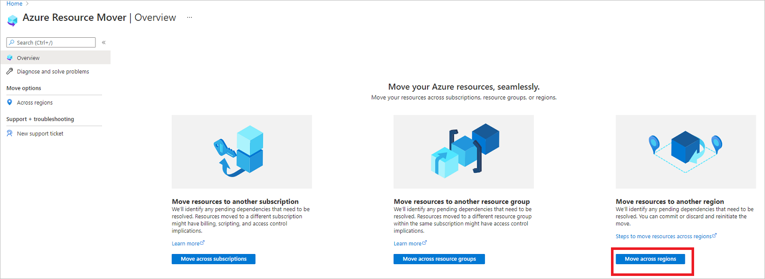 在 Azure 资源转移器的“概述”窗格上,选择“跨区域移动” 。