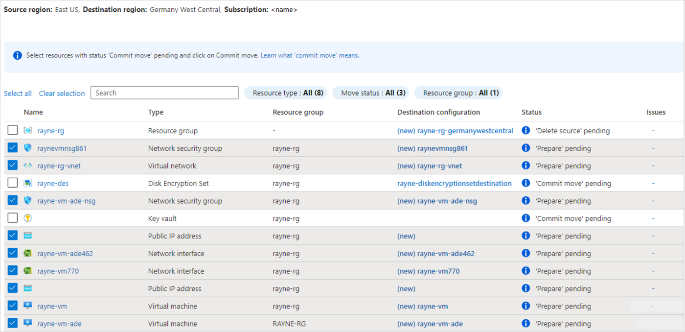 可以在所选源区域中的任何资源组中选择任何受支持的资源类型。 可以将资源移动到与源区域相同的订阅中的目标区域。 如果要更改订阅,可以在移动资源后进行更改。