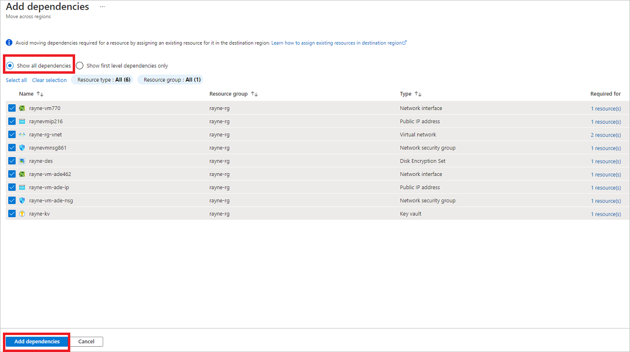 如果要移动的 VM 启用了 Azure 磁盘加密,则目标区域中的密钥保管库将会显示为依赖项。 如果要移动使用 CMK 进行服务器端加密的 VM,则目标区域中的磁盘加密集会显示为依赖项。