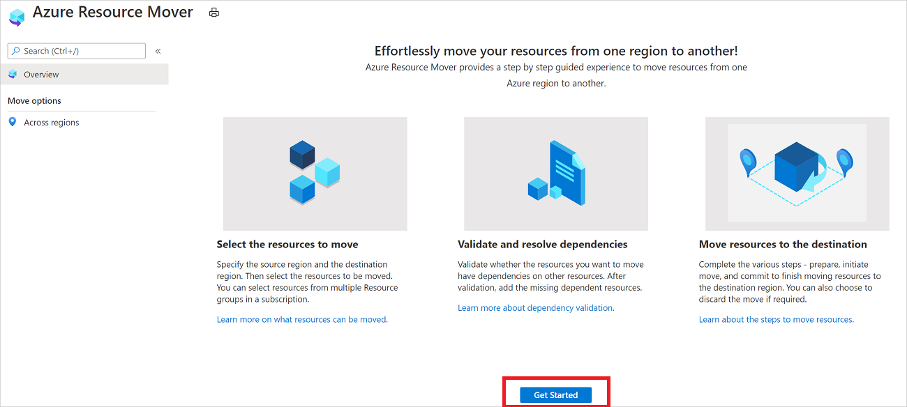 在 Azure 资源转移器的“概述”窗格上,选择“跨区域移动” 。