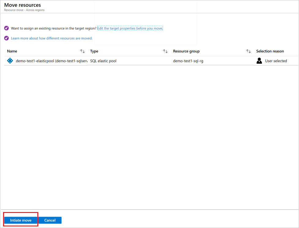 在“跨区域”中,选择源弹性池(演练中的 demo-test1-elasticpool),然后选择“启动移动”。