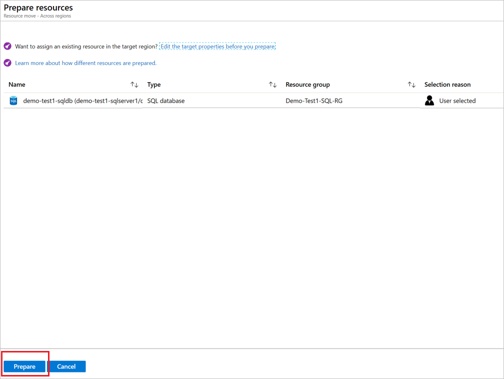Azure 资源移动器当前不会跨区域移动 SQL Server。 必须先在目标区域中分配目标 SQL Server,然后提交移动。