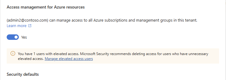You have X users with elevated access. Microsoft Security recommends deleting access for users who have unnecessary elevated access. Manage elevated access users