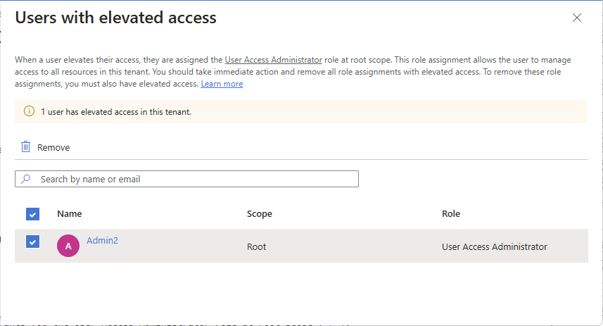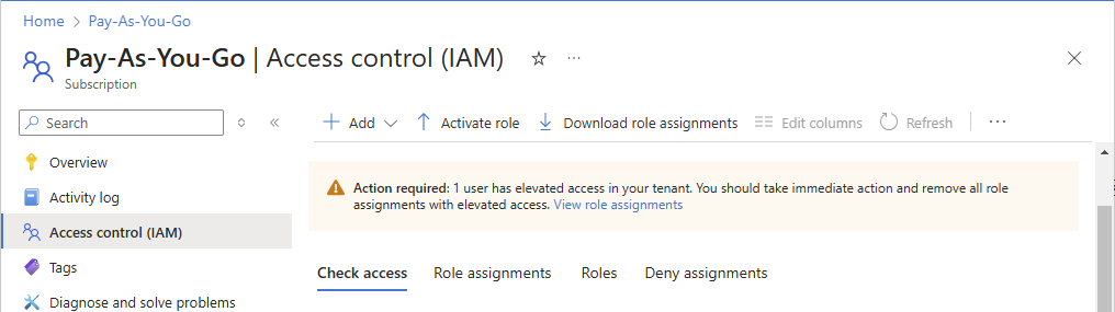Action required: X users have elevated access in your tenant. You should take immediate action and remove all role assignments with elevated access. View role assignments