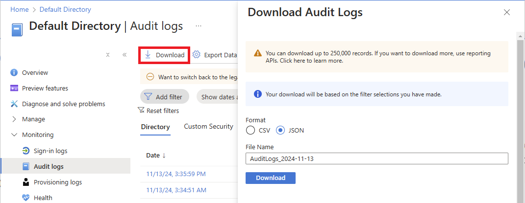 目录审核日志的屏幕截图,其中显示了用于下载日志的“下载审核日志”窗格。