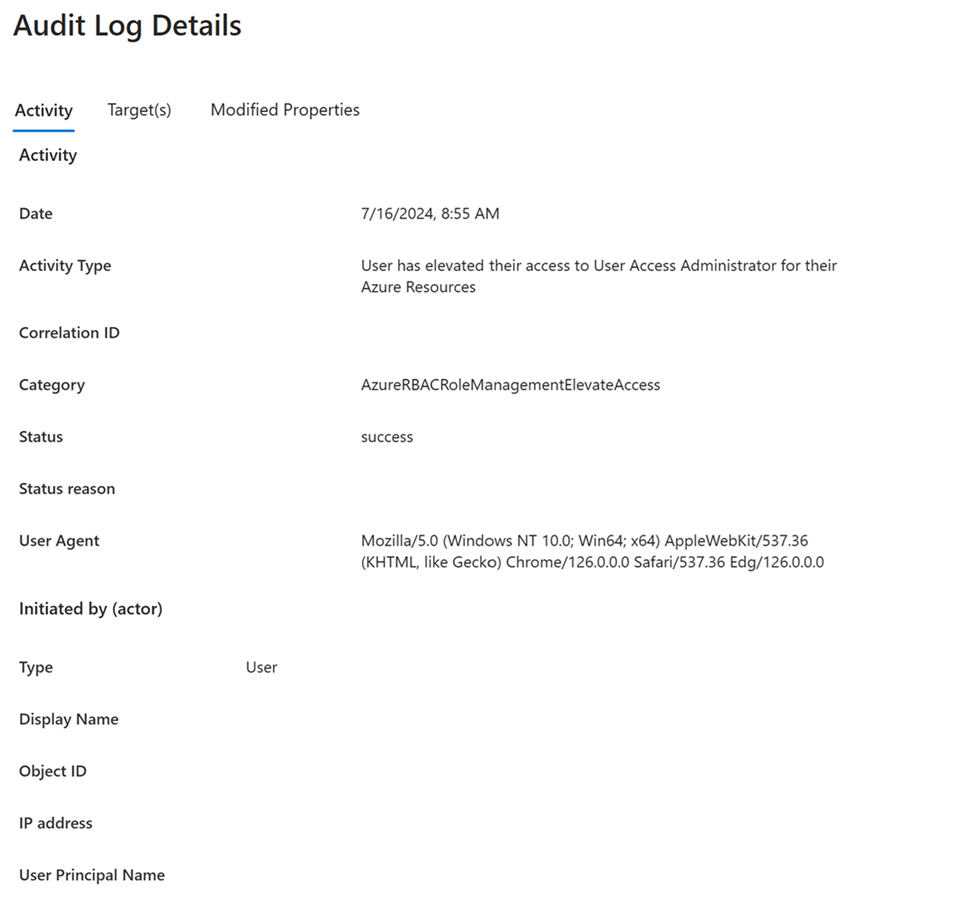 提升访问权限日志条目显示在 Microsoft Entra 目录审核日志和 Azure 活动日志中。 目录审核日志和活动日志的高级访问日志条目包含类似的信息。 但是,目录审核日志更易于筛选和导出。 此外,使用导出功能可以流式传输访问事件,这些事件可用于警报和检测解决方案,例如 Microsoft Sentinel 或其他系统。 有关如何将日志发送到不同目标的信息,请参阅为活动日志配置 Microsoft Entra 诊断设置