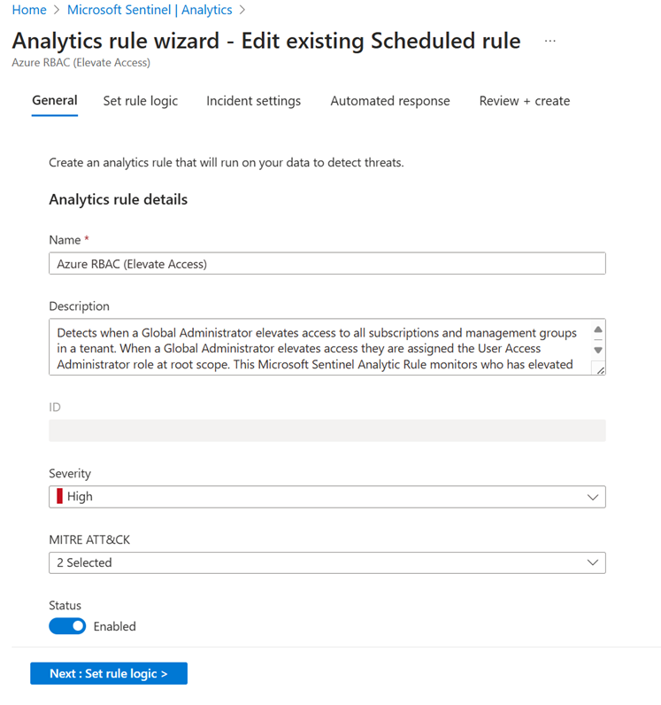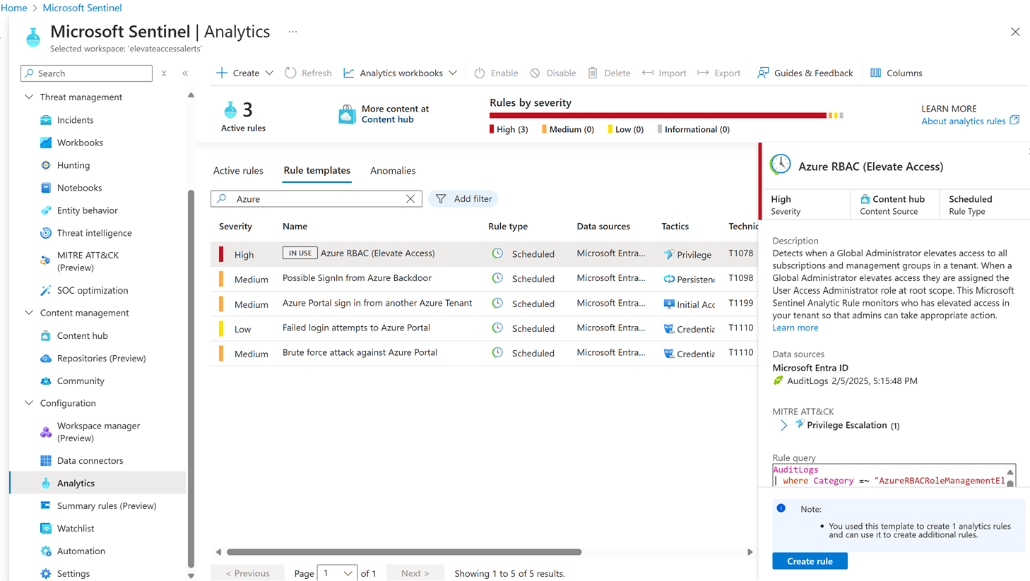 在此步骤中,在模板的基础上创建计划分析规则,以检查 Microsoft Entra 审核日志中提升访问权限的事件。