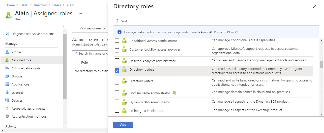 如果没有分配角色的权限,将禁用 “添加角色分配 ”选项。