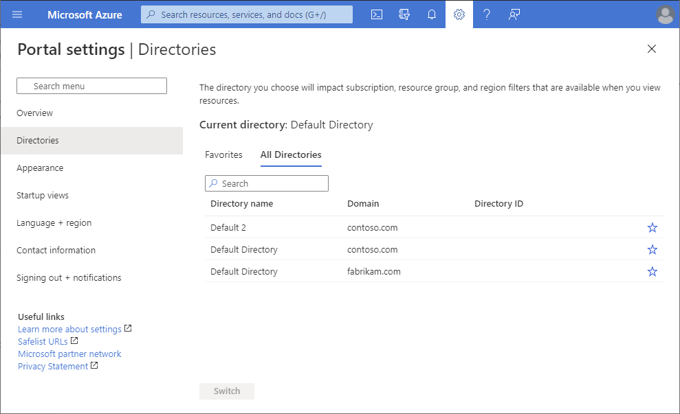 如果已向外部用户授予对目录的访问权限,但看不到他们在 Azure 门户中被授予其访问权限的资源,请确保外部用户选择了正确的目录。 外部用户可能有权访问多个目录。 若要切换目录,请在左上角选择“设置>”,然后选择相应的目录。