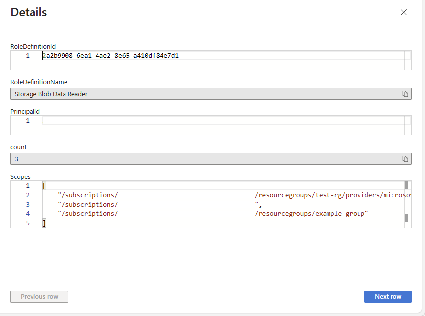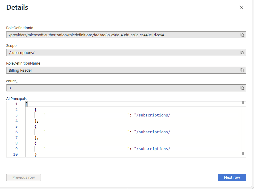 列 说明 PrincipalId 分配了内置角色的主体的 ID。 Scope 内置角色分配的范围。 count_ 具有相同主体和相同范围的内置角色分配数。 AllRD 内置角色的 ID 和名称。 在一行中,选择“查看详细信息”以打开“详细信息”窗格。