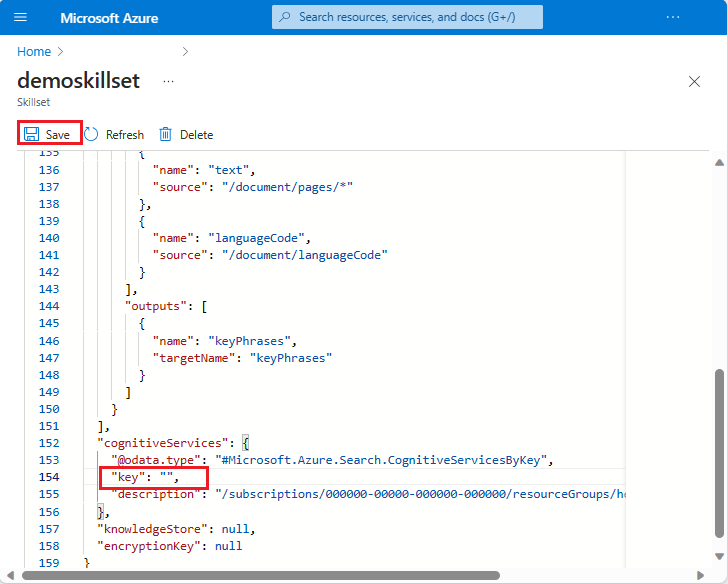 门户会自动附加类型为#Microsoft.Azure.Search.CognitiveServicesByKey的密钥。