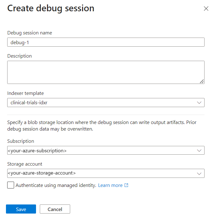 调试会话将在设置页面上打开。 可以修改初始配置并替代任何默认值。 调试会话仅适用于单个文档。 默认操作是接受集合中的第一个文档作为调试会话的基础。 可以通过在 Azure 存储中提供特定文档的 URI 来选择要调试的文档。