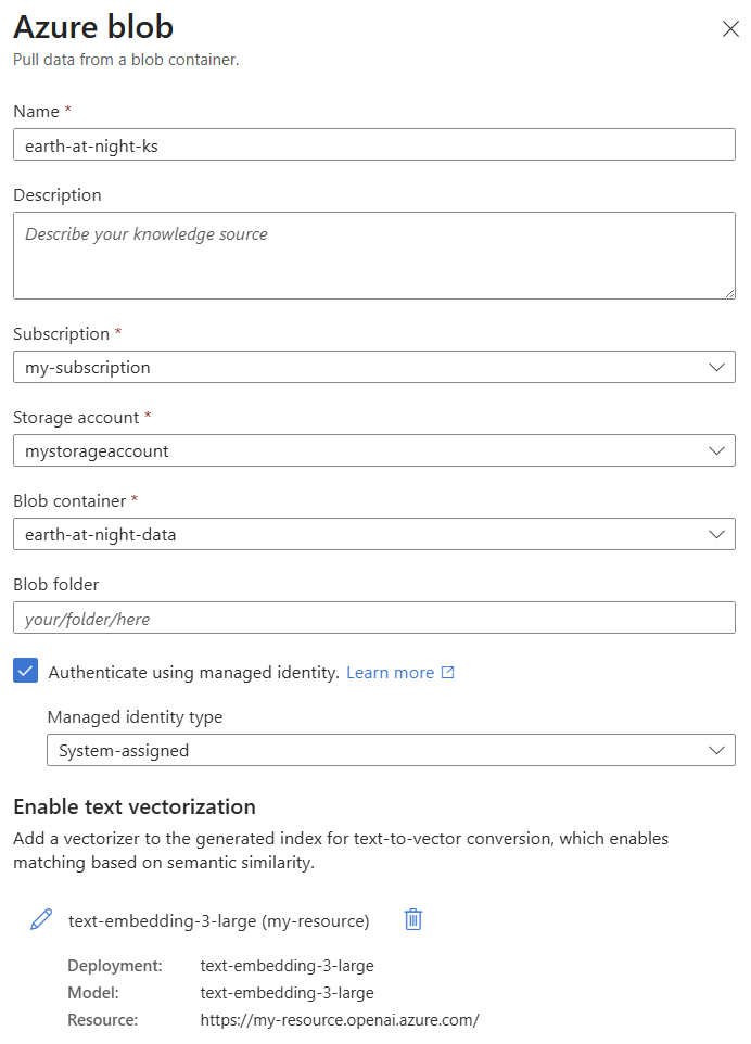 引用 Azure Blob Storage 中的容器的 知识来源。 创建 Blob 知识源时,Azure AI Search自动生成索引和其他管道对象来引入和扩充内容以进行代理检索。