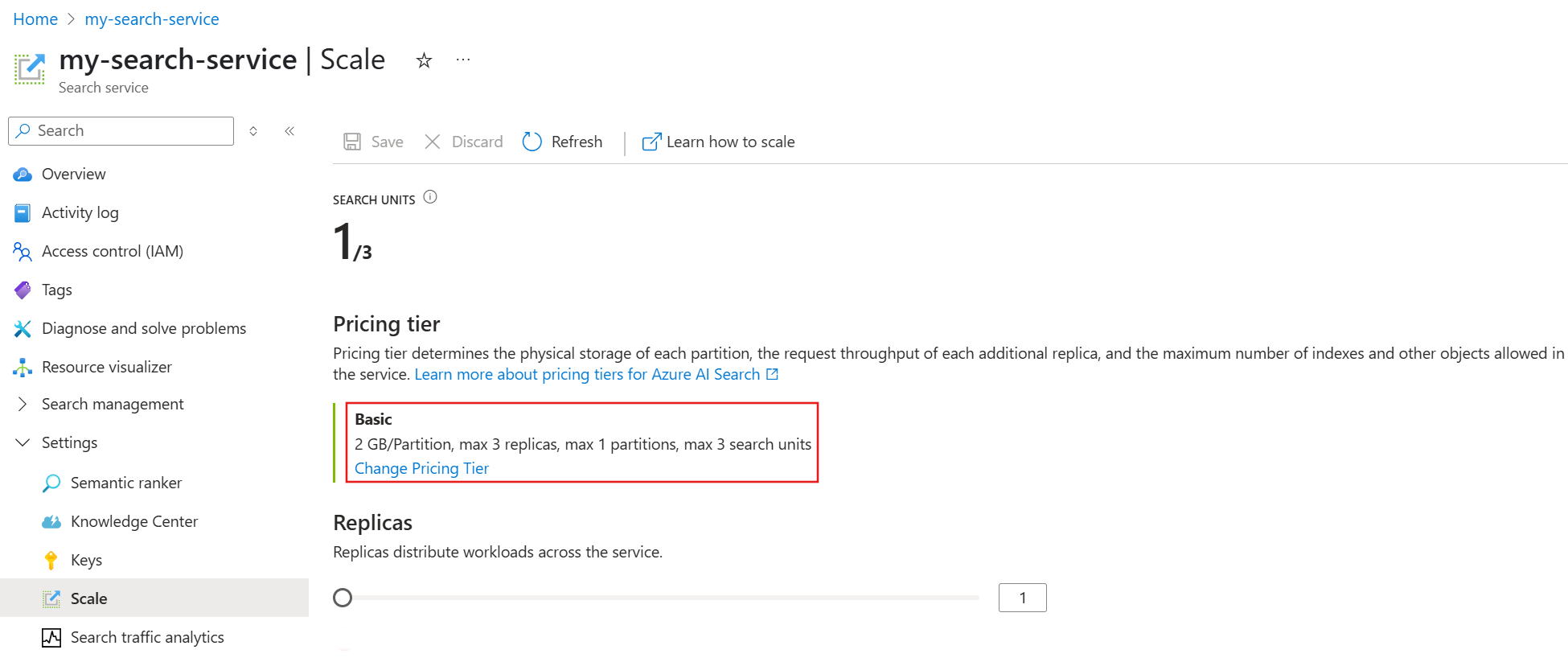 在 2024 年 4 月 3 日之前创建的搜索服务上,基本服务只能有一个分区和最多三个副本,最大限制为 3 个 SU。 唯一可调整的资源是副本。