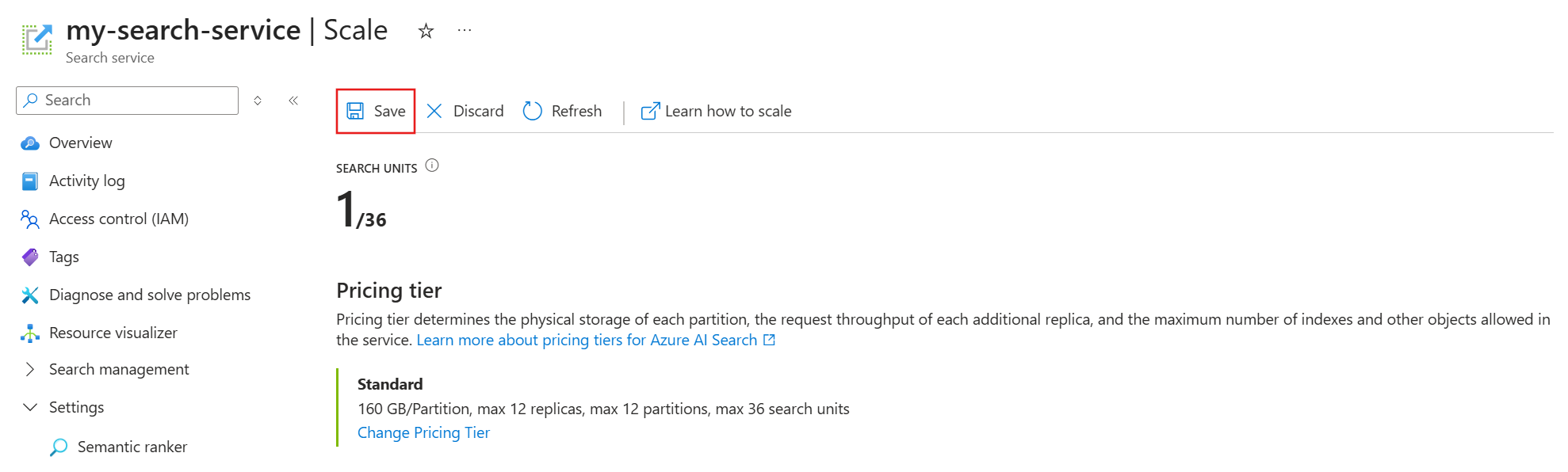 定价层确定搜索服务的最大存储。 如果需要更多或更少的容量,可以切换到满足存储需求的其他定价层。