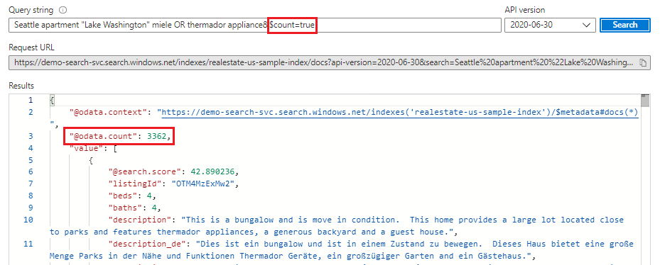 添加 "count": true 以获取在索引中找到的匹配项数。 在空白搜索中,计数是索引中的文档总数。 在限定搜索中,计数是与查询输入匹配的文档数。 回想一下,服务默认返回前 50 个匹配项,因此计数可能指示索引中的匹配项数大于结果中返回的内容。