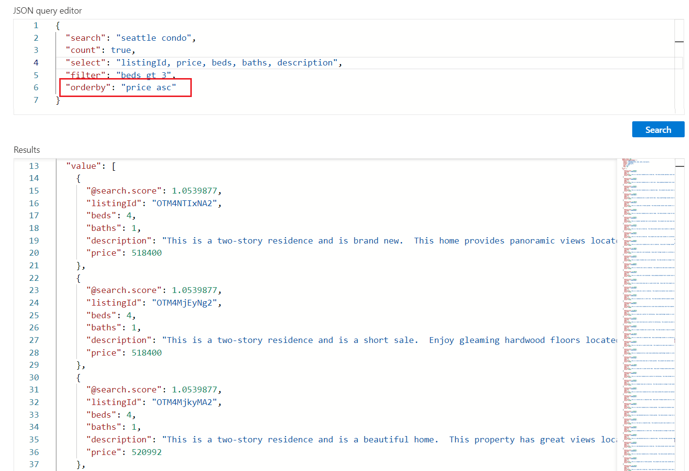 添加 orderby,按搜索分数之外的其他字段对结果排序。 字段必须在索引中标记为可排序。 在筛选的值相同(例如,相同价格)的情况下,订单是任意的,但可以添加更多条件进行更深入的排序。 下面是一个示例表达式,可用于测试此表达式:
