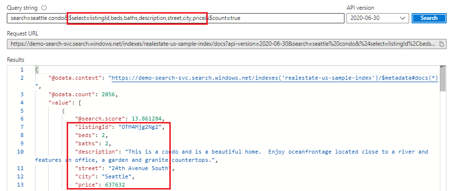 添加 "select" 以将结果限制到显式命名的字段,以便在 搜索资源管理器中获取更多可读输出。 只有索引中作为可检索属性的字段才会显示在结果中。