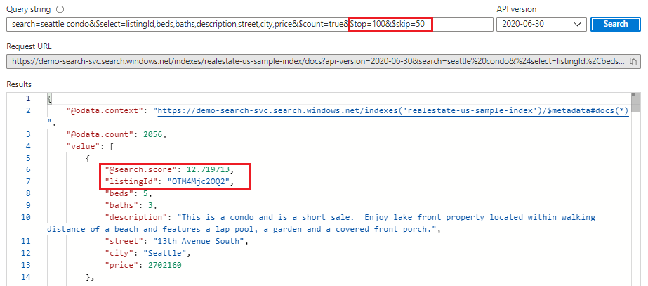 Azure AI 搜索根据搜索排名返回前 50 个匹配项。 酒店示例索引只有 50 家酒店,因此我们使用较小的数字来进行分页示例。 若要获取下一组匹配的文档,请将"top": 20和"skip": 10附加到结果集合中,使结果集扩展到 20 个文档(默认值为 50,最大值为 1000),并跳过前 10 个文档。 可以检查文档密钥 (HotelId) 来标识文档。