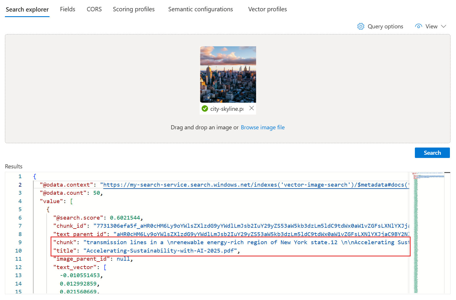 搜索资源管理器通过 图像视图接受图像作为查询输入,这要求你使用支持的向量化器与技能对。 有关详细信息,请参阅 在搜索索引中配置向量器。