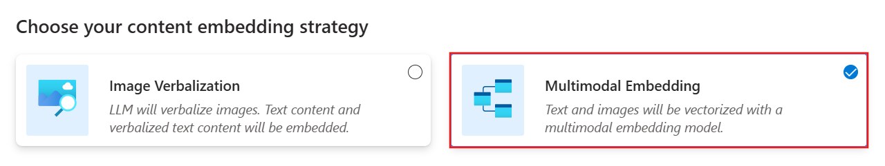 对于嵌入, Azure AI 视觉多模式嵌入技能 使用已部署的嵌入模型将文本区块和口头描述转换为高维矢量。 这些向量可实现相似性和混合检索。