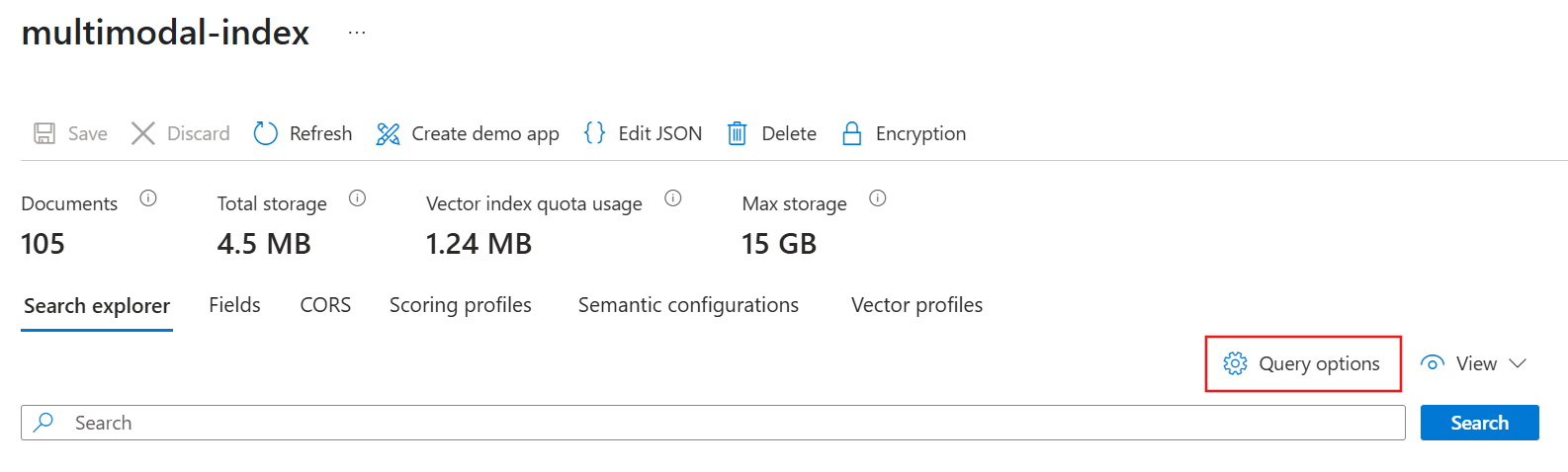 本快速入门创建一个多模式索引,该索引支持对文本和图像进行 混合搜索 。 除非使用直接多模式嵌入,否则索引不接受图像作为查询输入,这需要具有等效向量器的Azure AI Vision多模式嵌入技能。 有关详细信息,请参阅 在搜索索引中配置向量器。