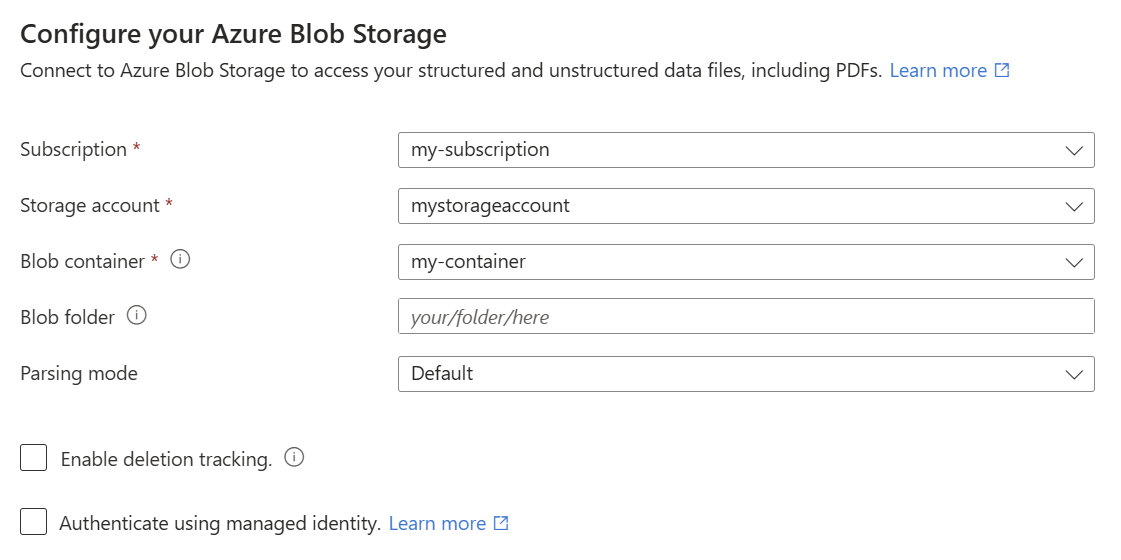 Azure 门户中 Azure Blob Storage 数据源选项的屏幕截图。 选择 关键字搜索。